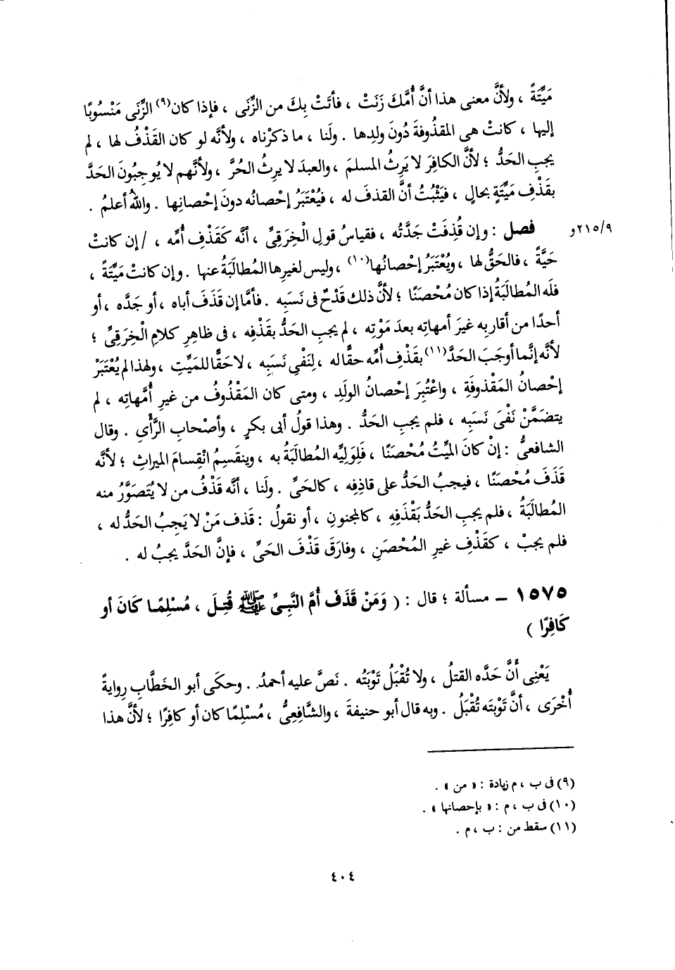 مَيِّتَةً، ولأنَّ معنى هذا أنَّ أُمَّكَ زَنَتْ، فأتَتْ بِكَ من الزِّنَى، فإذا كان (٩) الزِّنَى مَنْسُوبًا إليها، كانتْ هي المقذُوفةَ دُونَ ولدِها. ولَنا، ما ذكرْناه، ولأنَّه لو كان القَذْفُ لها، لم يجبِ الحَدُّ؛ لأنَّ الكافِرَ لا يَرِثُ المسلمَ، والعبدَ لا يرِثُ الحُرَّ، ولأنَّهم لا يُوجِبُونَ الحَدَّ بقَذْفِ مَيِّتَةٍ بحالٍ، فيَثْبُتُ أنَّ القذفَ له، فيُعْتَبَرُ إحْصانُه دونَ إحْصانِها. واللهُ أعلمُ.