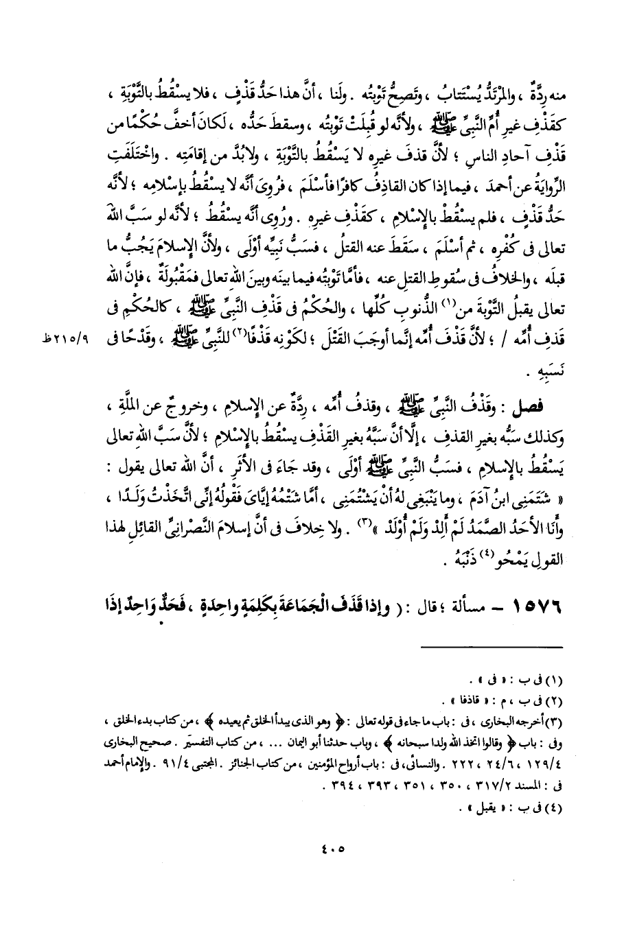 فصل: وقَذْفُ النَّبِيِّ -صلى اللَّه عليه وسلم-، وقذفُ أُمِّه، رِدَّةٌ عن الإِسلامِ، وخروجٌ عن الملَّةِ، وكذلك سَبُّه بغيرِ القذفِ، إِلَّا أنَّ سَبَّهُ بغيرِ القَذْفِ يسْقُطُ بالإِسْلامِ؛ لأنَّ سَبَّ اللهِ تعالى يَسْقُطُ بالإِسلامِ، فسَبُّ النَّبِيِّ -صلى اللَّه عليه وسلم- أوْلَى، وقد جَاءَ في الأَثَرِ، أنَّ اللَّه تعالى يقول: "شَتَمَنِى ابنُ آدَمَ، وما يَنْبَغِى لهُ أنْ يَشْتُمَنِى، أمَّا شَتْمُهُ إيَّاىَ فَقْولُهُ إنِّي اتَّخَذْتُ وَلَدًا، وأَنَا الأحَدُ الصَّمَدُ لَمْ أَلِدْ وَلَمْ أُوْلَدْ" (٣). ولا خِلافَ في أنَّ إسلامَ النَّصْرانِىِّ القائِلِ لهذا القولِ يَمْحُو (٤) ذَنْبَهُ.