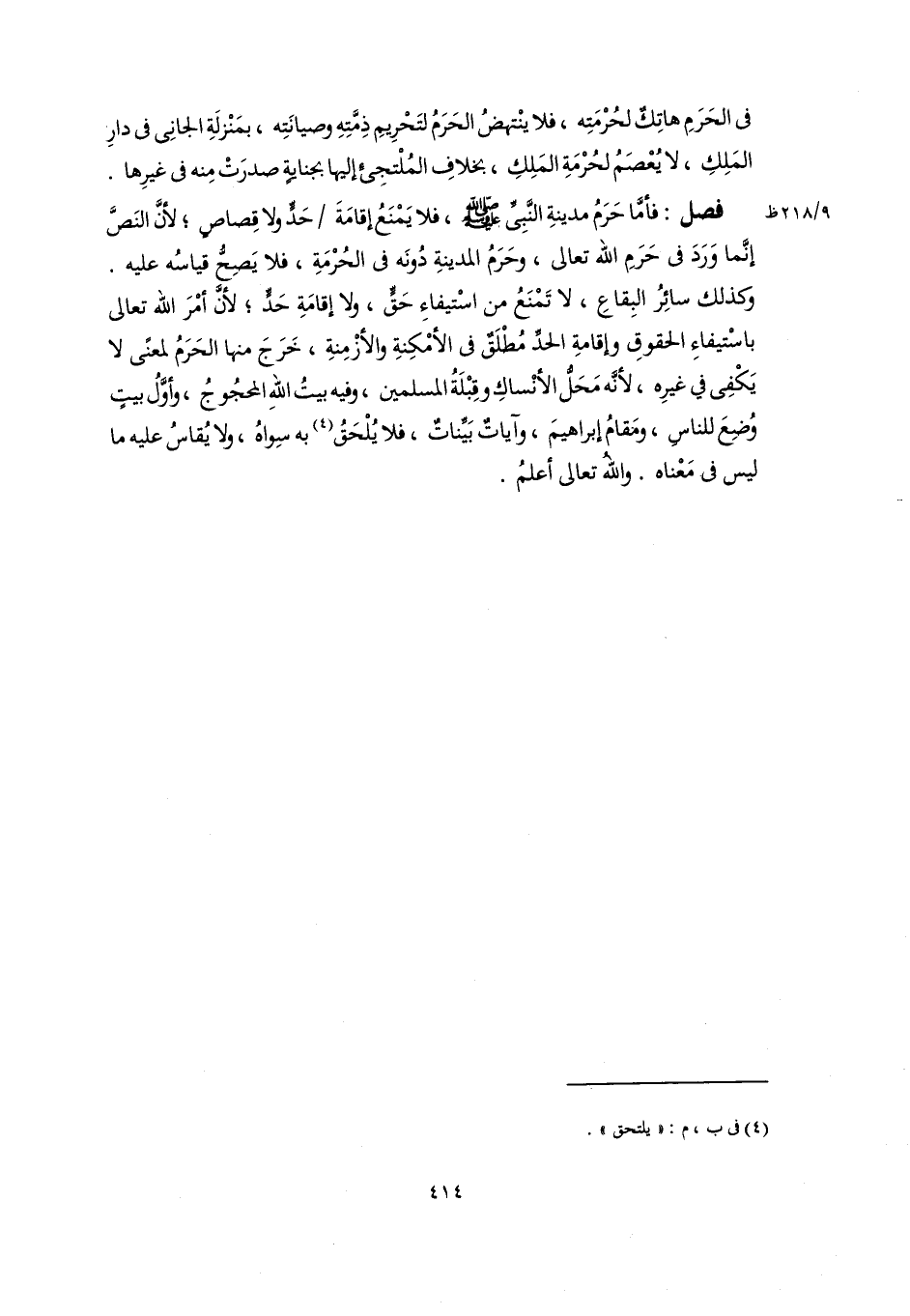 فصل: فأمَّا حَرَمُ مدينةِ النَّبِىِّ -صلى اللَّه عليه وسلم-، فلا يَمْنَعُ إقامَةَ حَدٍّ ولا قِصاصٍ؛ لأنَّ النَصَّ إنَّما وَرَدَ في حَرَمِ اللَّه تعالى، وحَرَمُ المدينةِ دُونَه في الحُرْمَةِ، فلا يَصِحُّ قياسُه عليه. وكذلك سائِرُ البِقاعِ، لا تَمْنَعُ من اسْتيفاءِ حَقٍّ، ولا إقامَةِ حَدٍّ؛ لأنَّ أمْرَ اللَّه تعالى باسْتيفاءِ الحقوقِ وإقامةِ الحدِّ مُطْلَقٌ في الأمْكِنةِ والأزْمِنةِ، خَرَجَ منها الحَرَمُ لمعنًى لا يَكْفِى في غيرِه، لأنَّه مَحَلُّ الأنْساكِ وقِبْلَةُ المسلمين، وفيه بيتُ اللهِ المحجُوجُ، وأوَّلُ بيتٍ وُضِعَ للناسِ، ومَقامُ إبراهيمَ، وآياتٌ بَيِّنَاتٌ، فلا يُلْحَقُ (٤) به سِواهُ، ولا يُقاسُ عليه ما ليس في مَعْناه. واللهُ تعالى أعلمُ.