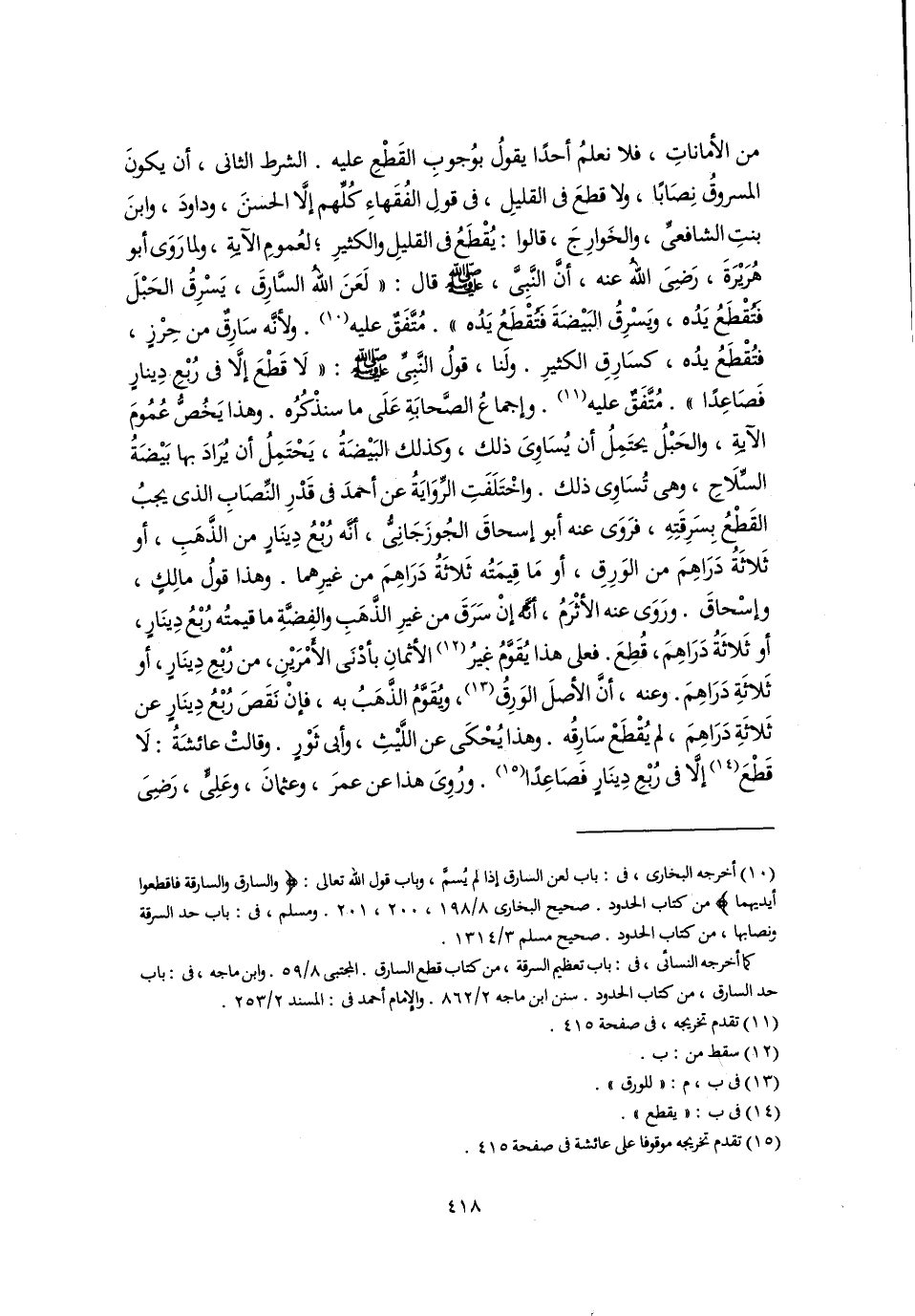 من الأماناتِ، فلا نعلمُ أحدًا يقولُ بوُجوبِ القَطْعِ عليه. الشرط الثاني، أن يكونَ المسروقُ نِصَابًا، ولا قطعَ في القليلِ، في قولِ الفُقَهاءِ كُلِّهم إلَّا الحسنَ، وداودَ، وابنَ بنتِ الشافعىِّ، والخَوارِجَ، قالوا: يُقْطَعُ في القليلِ والكثيرِ؛ لعُمومِ الآيَةِ، ولما رَوَى أبو هُرَيْرَةَ، رَضِىَ اللهُ عنه، أنَّ النَّبِىَّ، -صلى اللَّه عليه وسلم- قال: "لَعَنَ اللهُ السَّارِقَ، يَسْرِقُ الحَبْلَ فَتُقْطَعُ يَدُه، ويَسْرِقُ البَيْضَةَ فَتُقْطَعُ يَدُه". مُتَّفَقٌ عليه (١٠). ولأنَّه سَارِقٌ من حِرْزٍ، فتُقْطَعُ يدُه، كسَارِقِ الكثيرِ. ولَنا، قولُ النَّبِىِّ -صلى اللَّه عليه وسلم-: "لَا قَطْعَ إلَّا في رُبْعِ دِينارٍ فَصَاعِدًا". مُتَّفَقٌ عليه (١١). وإجماعُ الصَّحابَةِ عَلَى ما سنذْكُرُه. وهذا يَخُصُّ عُمُومَ الآيةِ، والحَبْلُ يحتَمِلُ أن يُسَاوِىَ ذلك، وكذلك البَيْضَةُ، يَحْتَمِلُ أن يُرَادَ بها بَيْضَةُ السِّلَاحِ، وهى تُسَاوِى ذلك. واخْتَلَفَتِ الرِّوَايَةُ عن أحمدَ في قَدْرِ النِّصَابِ الذي يجبُ القَطْعُ بِسَرِقَتِهِ، فرَوَى عنه أبو إسحاقَ الجُوزَجَانِىُّ، أنَّه رُبْعُ دِينَارٍ من الذَّهَبِ، أو ثَلاثَةُ دَرَاهِمَ من الوَرِقِ، أو مَا قِيمَتُه ثَلاثَةُ دَرَاهِمَ من غيرِهما. وهذا قولُ مالِكٍ، وإسْحاقَ. ورَوَى عنه الأثْرَمُ، أنَّه إِنْ سَرَقَ من غيرِ الذَّهَبِ والفِضَّةِ ما قيمتُه رُبْعُ دِينَارٍ، أو ثَلاثَةُ دَرَاهِمَ، قُطِعَ. فعلى هذا يُقَوَّمُ غيرُ (١٢) الأثمانِ بأدْنَى الأَمْرَيْنِ، من رُبْعِ دِينَارٍ، أو ثَلاثَةِ دَرَاهِمَ. وعنه، أنَّ الأصلَ الوَرِقُ (١٣)، ويُقَوَّمُ الذَّهَبُ به، فإنْ نَقَصَ رُبْعُ دِينَارٍ عن ثَلاثَةِ دَرَاهِمَ، لم يُقْطَعْ سَارِقُه. وهذا يُحْكَى عن اللَّيْثِ، وأبي ثَوْرٍ. وقالتْ عائشَةُ: لَا قَطْعَ (١٤) إلَّا في رُبْعِ دِينَارٍ فَصَاعِدًا (١٥). ورُوِىَ هذا عن عمرَ، وعثمانَ، وعَلِيٍّ، رَضِىَ