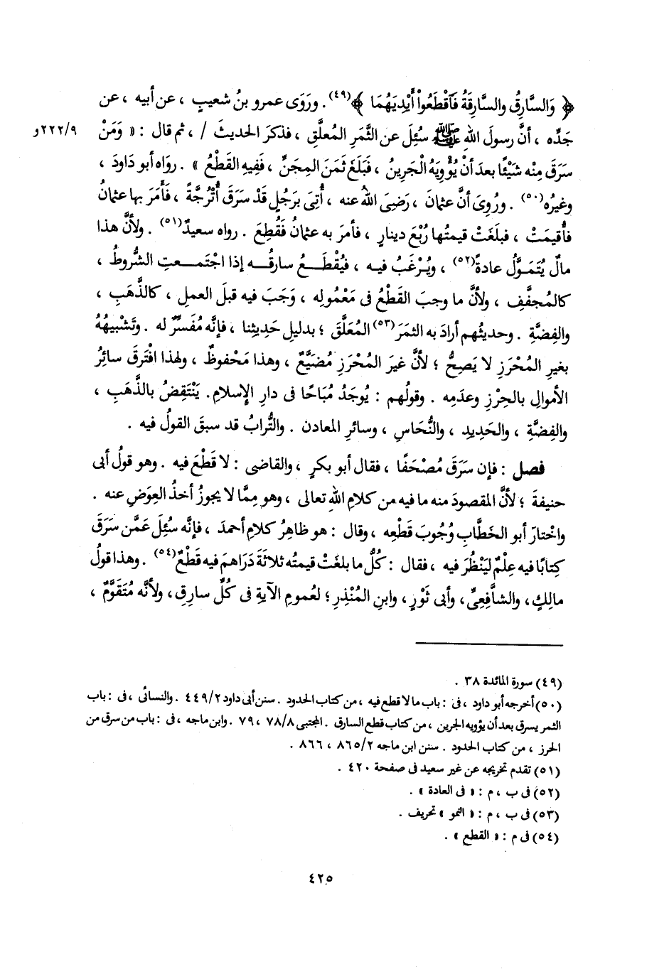فصل: فإن سَرَقَ مُصْحَفًا، فقال أبو بكرٍ، والقاضى: لا قَطْعَ فيه. وهو قولُ أبى حنيفةَ؛ لأنَّ المقصودَ منه ما فيه من كلامِ اللهِ تعالى، وهو مِمَّا لا يجوزُ أخذُ العِوَضِ عنه. واخْتارَ أبو الخَطَّابِ وُجُوبَ قَطْعِه، وقال: هو ظاهِرُ كلامِ أحمدَ، فإنَّه سُئِلَ عَمَّن سَرَقَ كِتابًا فيه عِلْمٌ ليَنْظُرَ فيه، فقال: كُلُّ ما بلغَتْ قيمتُه ثلاثَةَ دَرَاهمَ فيه قَطْعٌ (٥٤). وهذا قولُ مالِكٍ، والشَّافِعِىِّ، وأبى ثَوْرٍ، وابنِ المُنْذِرِ؛ لعُمومِ الآيةِ في كُلِّ سارِقِ، ولأنَّه مُتَقَوَّمٌ،