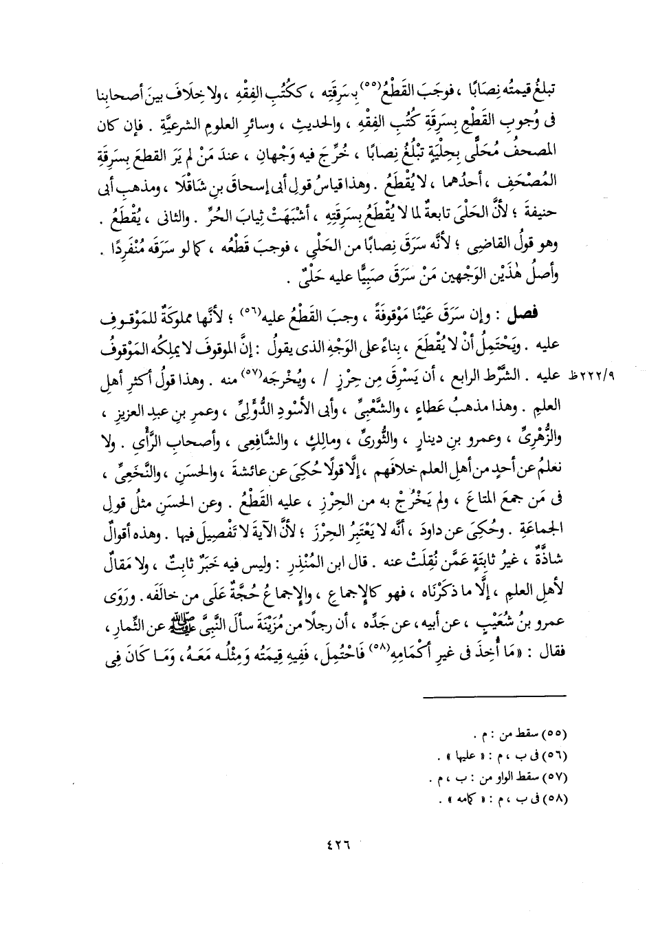 تبلغُ قيمتُه نِصَابًا، فوجَبَ القَطْعُ (٥٥) بِسَرِقَتِه، ككُتُبِ الفِقْهِ، ولا خِلَافَ بينَ أصحابِنا في وُجوبِ القَطْعِ بِسَرِقَةِ كُتُبِ الفِقْهِ، والحديثِ، وسائرِ العلومِ الشرعيَّةِ. فإن كان المصحفُ مُحَلَّى بِحِلْيَةٍ تبْلُغُ نِصابًا، خُرِّجَ فيه وَجْهانِ، عندَ مَنْ لم يَرَ القطعَ بِسَرِقَةِ المُصْحَفِ، أحدُهما، لا يُقْطَعُ. وهذا قياسُ قولِ أبى إسحاقَ بنِ شَاقْلَا، ومذهبِ أبى حنيفةَ؛ لأنَّ الحَلْىَ تابعةٌ لما لا يُقْطَعُ بِسَرِقَتِهِ، أشْبَهَتْ ثِيابَ الحُرِّ. والثانى، يُقْطَعُ. وهو قولُ القاضِى؛ لأنَّه سَرَقَ نِصابًا من الحَلْىِ، فوجبَ قَطْعُه، كما لو سَرَقَه مُنْفَرِدًا. وأصلُ هذَيْن الوَجْهين مَنْ سَرَقَ صَبِيًّا عليه حَلْىٌ.