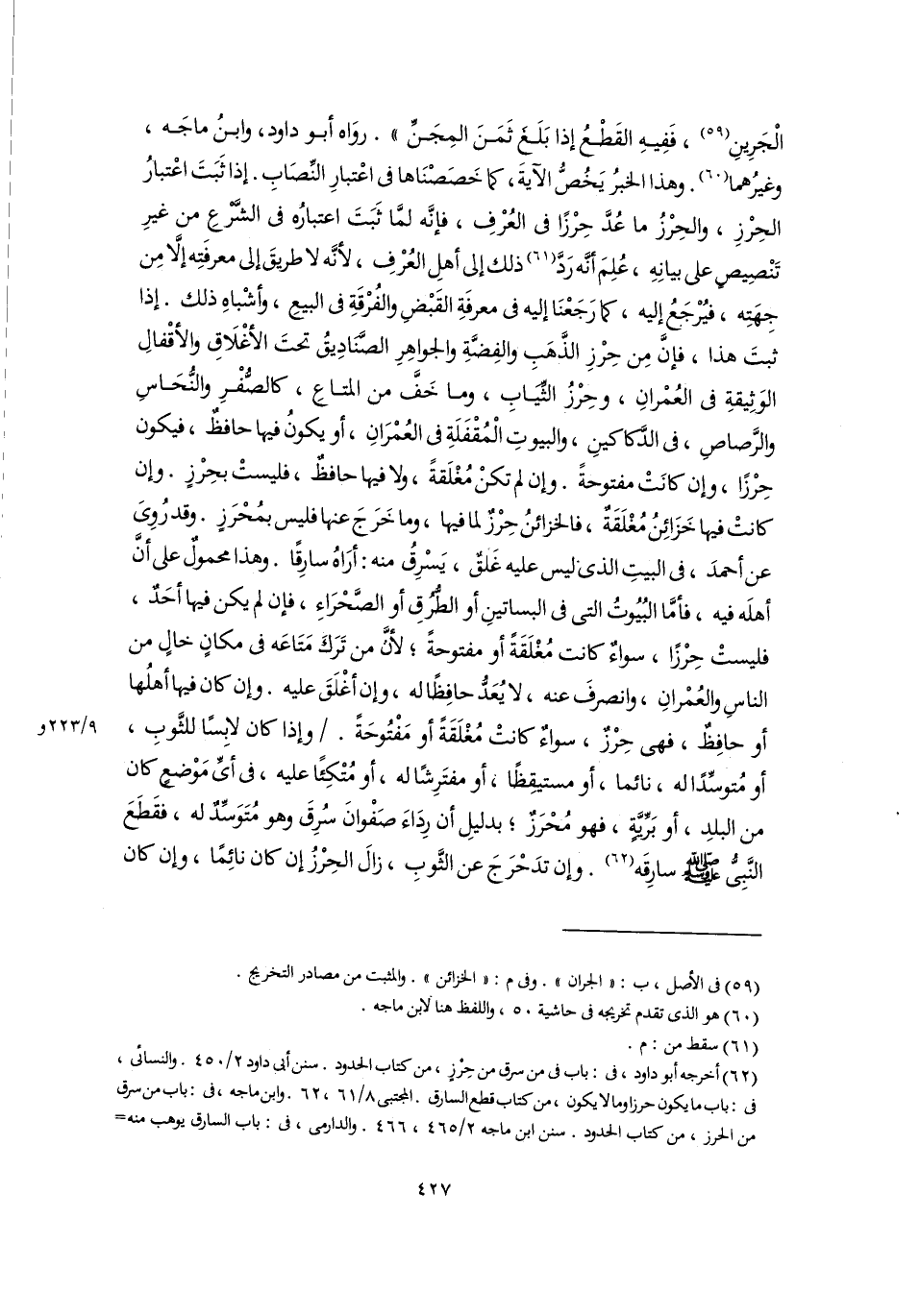 الْجَرِينِ (٥٩)، فَفِيهِ القَطْعُ إذا بَلَغَ ثَمَنَ المِجَنِّ". روَاه أبو داود، وابنُ ماجَه، وغيرُهما (٦٠). وهذا الخبرُ يَخُصُّ الآيةَ، كما خَصَصْنَاها في اعْتبارِ النِّصَابِ. إذا ثَبَتَ اعْتبارُ الحِرْزِ، والحِرْزُ ما عُدَّ حِرْزًا في العُرْفِ، فإنَّه لمَّا ثَبَتَ اعتبارُه في الشَّرْعِ من غيرِ تَنْصِيصٍ على بيانِهِ، عُلِمَ أنَّه رَدَّ (٦١) ذلك إلى أهلِ العُرْفِ، لأنَّه لا طريقَ إلى معرفَتِه إلَّا مِن جِهَتِه، فيُرْجَعُ إليه، كما رَجَعْنَا إليه في معرفَةِ القَبْضِ والفُرْقَةِ في البيعِ، ؤاشْباهِ ذلك. إذا ثبتَ هذا، فإنَّ مِن حِرْزِ الذَّهَبِ والفِضَّةِ والجواهِرِ الصَّنَادِيقُ تحتَ الأغْلَاقِ والأقْفالِ الوَثِيقةِ في العُمْرانِ، وحِرْزُ الثِّيَابِ، وما خَفَّ من المتاعِ، كالصُّفْرِ والنُّحَاسِ والرَّصاصِ، في الدَّكاكينِ، والبيوتِ الْمُقْفَلَةِ في العُمْرَانِ، أو يكونُ فيها حافظٌ، فيكون حِرْزًا، وإن كانَتْ مفتوحةً. وإن لم تكنْ مُغْلَقةً، ولا فيها حافظٌ، فليستْ بحِرْزٍ. وإن كانتْ فيها خَزَائِنُ مُغْلَقَةٌ، فالخزائنُ حِرْزٌ لما فيها، وما خَرَجَ عنها فليس بمُحْرَزٍ. وقد رُوِىَ عن أحمدَ، في البيتِ الذي ليس عليه غَلقٌ، يَسْرِقُ منه: أرَاهُ سارِقًا. وهذا محمولٌ على أنَّ أهلَه فيه، فأمَّا البُيُوتُ التي في البساتينِ أو الطُّرُقِ أو الصَّحْرَاءِ، فإن لم يكن فيها أحَدٌ، فليستْ حِرْزًا، سواءٌ كانت مُغْلَقَةً أو مفتوحةً؛ لأنَّ من تَرَكَ مَتَاعَه في مكانٍ خالٍ من الناسِ والعُمْرانِ، وانصرفَ عنه، لا يُعَدُّ حافِظًا له، وإن أغْلَقَ عليه. وإن كان فيها أهلُها أو حافِظٌ، فهى حِرْزٌ، سواءٌ كانتْ مُغْلَقَةً أو مَفْتُوحَةً. وإذا كان لاِبسًا للثَّوبِ، أو مُتوسِّدًا له، نائما، أو مستيقِظًا، أو مفتَرِشًا له، أو مُتكِئًا عليه، في أىِّ مَوْضعٍ كان من البلدِ، أو بَرِّيَّةٍ، فهو مُحْرَزٌ؛ بدليلِ أن رِدَاءَ صَفْوانَ سُرِقَ وهو مُتَوَسِّدٌ له، فقَطَعَ النَّبِىُّ -صلى اللَّه عليه وسلم- سارِقَه (٦٢). وإن تدَحْرَجَ عن الثَّوبِ، زالَ الحِرْزُ إن كان نائِمًا، وإن كان