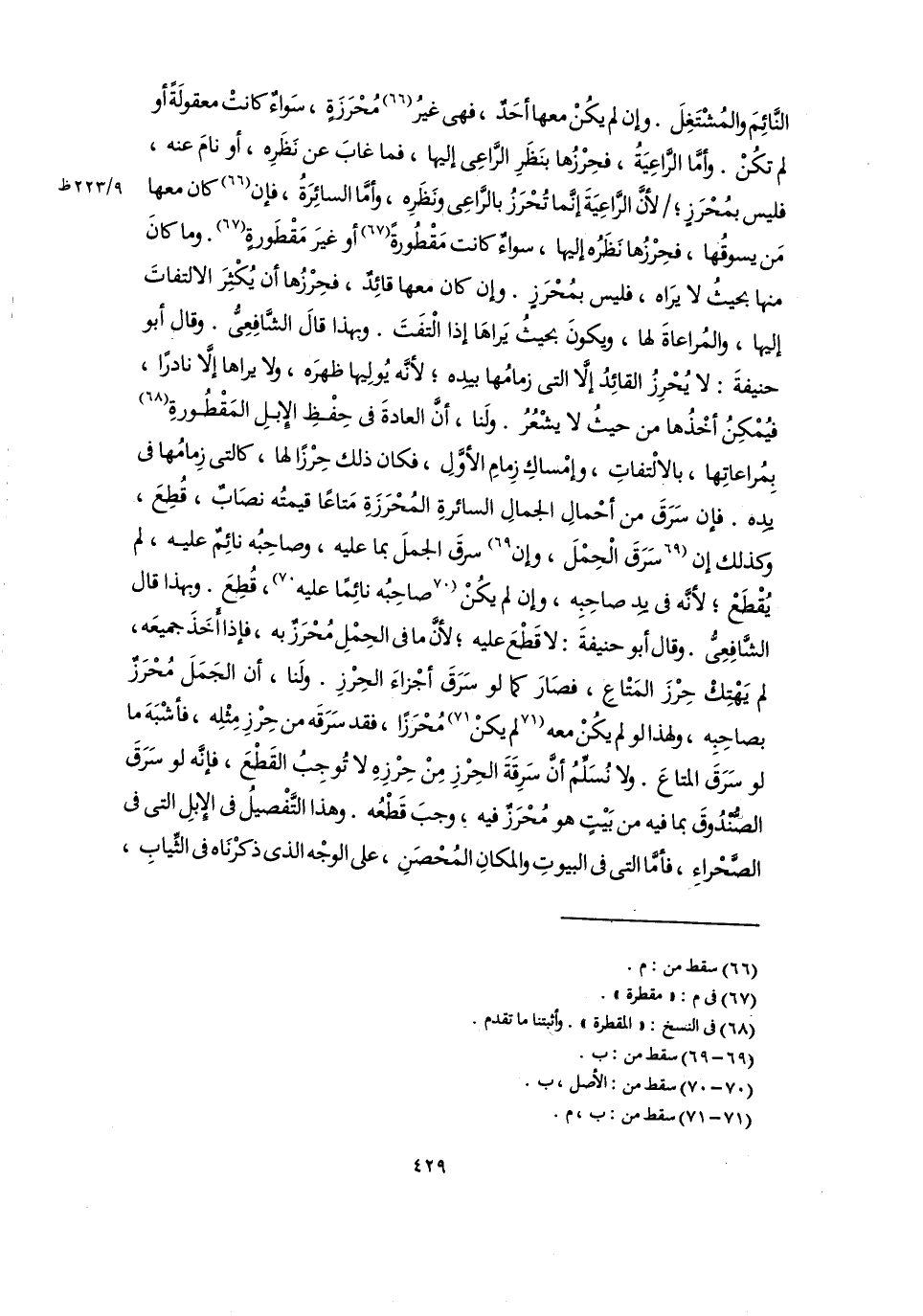 النَّائِمَ والمُشْتَغِلَ. وإن لم يكُنْ معها أحَدٌ، فهى غيرُ (٦٦) مُحْرَزَةٍ، سَواءٌ كانتْ معقولَةً أو لم تكُنْ. وأمَّا الرَّاعِيَةُ، فحِرْزُها بنَظَرِ الرَّاعِى إليها، فما غابَ عن نَظَرِه، أو نامَ عنه، فليس بمُحْرَزٍ؛ لأنَّ الرَّاعِيَةَ إنَّما تُحْرَزُ بالرَّاعِى ونَظَرِه، وأمَّا السائِرَةُ، فإن (٦٦) كان معها مَن يسوقُها، فحِرْزُها نَظَرُه إليها، سواءٌ كانت مَقْطُورةً (٦٧) أو غيرَ مَقْطَورةٍ (٦٧). وما كانَ منها بحيثُ لا يرَاه، فليس بمُحْرَزٍ. وإن كان معها قائِدٌ، فحِرْزُها أن يُكْثِرَ الالتفاتَ إليها، والمُراعاةَ لها، ويكونَ بحيثُ يَراهَا إذا الْتفَتَ. وبهذا قالَ الشَّافِعِىُّ. وقال أبو حنيفةَ: لا يُحْرِزُ القائِدُ إلَّا التي زمامُها بيدِه؛ لأنَّه يُولِيها ظهرَه، ولا يراها إلَّا نادرًا، فيُمْكِنُ أخْذُها من حيثُ لا يشْعُرُ. وَلنا، أنَّ العادةَ في حِفْظِ الإِبلِ المَقْطُورةِ (٦٨) بِمُراعاتِها، بالالْتفاتِ، وإمْساكِ زِمامِ الأوَّلِ، فكان ذلك حِرْزًا لها، كالتى زِمامُها في يدِه. فإن سَرَقَ من أحْمالِ الجمالِ السائرةِ المُحْرَزَةِ مَتاعًا قيمتُه نصَابٌ، قُطِعَ، وكذلك إن [سَرَقَ الْحِمْلَ، وإن] (٦٩) سرَق الجملَ بما عليه، وصاحِبُه نائِمٌ عليه، لم يُقْطَعْ؛ لأنَّه في يدِ صاحِبِه، وإن لم يكُنْ [صاحِبُه نائِمًا عليه] (٧٠)، قُطِعَ. وبهذا قال الشَّافِعِىُّ. وقال أبو حنيفةَ: لا قَطْعَ عليه؛ لأنَّ ما في الحِمْلِ مُحْرَزٌ به، فإذا أَخَذَ جميعَه، لم يَهْتِكْ حِرْزَ المَتاعِ، فصَارَ كما لو سَرَقَ أجْزاءَ الحِرْزِ. ولَنا، أن الجَمَلَ مُحْرَزٌ بصاحِبِه، ولهذا لو لم يكُنْ معه [لم يكنْ] (٧١) مُحْرَزًا، فقد سَرَقَه من حِرْزِ مِثْلِه، فأشْبَهَ ما لو سَرَقَ المتاعَ. ولا نُسَلِّمُ أنَّ سَرِقَةَ الحِرْزِ مِنْ حِرْزِهِ لا تُوجِبُ القَطْعَ، فإنَّه لو سَرَقَ الصُّنْدُوقَ بما فيه من بَيْتٍ هو مُحْرَزٌ فيه، وجبَ قَطْعُه. وهذا التَّفْصيلُ في الإِبلِ التي في الصَّحْراءِ، فأمَّا التي في البيوتِ والمكانِ المُحْصَنِ، على الوجْه الذي ذكرْنَاه في الثِّيابِ،