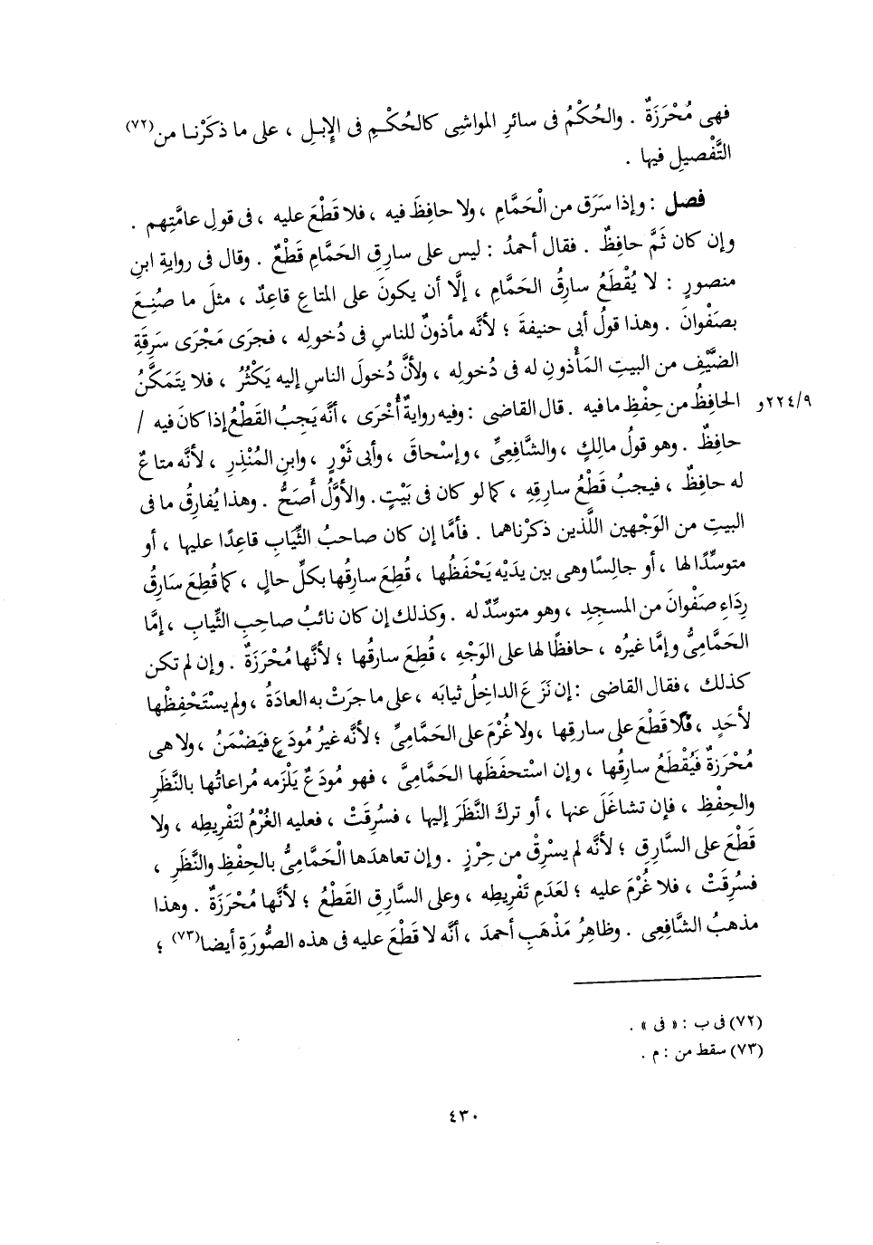 فصل: وإذا سَرَق من الْحَمَّامِ، ولا حافِظَ فيه، فلا قَطْعَ عليه، في قولِ عامَّتِهم. وإن كان ثَمَّ حافِظٌ. فقال أحمدُ: ليس على سارِقِ الحَمَّامِ قَطْعٌ. وقال في روايةِ ابنِ منصورٍ: لا يُقْطَعُ سارِقُ الحَمَّامِ، إلَّا أن يكونَ على المتاعِ قاعِدٌ، مثلَ ما صُنِعَ بصَفْوانَ. وهذا قولُ أبى حنيفةَ؛ لأنَّه مأذونٌ للناسِ في دُخولِه، فجرَى مَجْرَى سَرِقَةِ الضَّيْفِ من البيتِ المَأْذونِ له في دُخولِه، ولأنَّ دُخولَ الناسِ إليه يَكْثُرُ، فلا يتَمَكَّنُ الحافِظُ من حِفْظِ ما فيه. قال القاضي: وفيه روايةٌ أُخْرَى، أنَّه يَجِبُ القَطْعُ إذا كانَ فيه حافِظٌ. وهو قولُ مالِكٍ، والشَّافِعِىِّ، وإسْحاقَ، وأبى ثَوْرٍ، وابنِ المُنْذِرِ، لأنَّه متاعٌ له حافِظٌ، فيجبُ قَطْعُ سارِقِهِ، كما لو كان في بَيْتٍ. والأوَّلُ أَصَحُّ. وهذا يُفارِقُ ما في البيتِ من الوَجْهين اللَّذين ذكرْناهما. فأمَّا إن كان صاحبُ الثِّيَابِ قاعِدًا عليها، أو متوسِّدًا لها، أو جالِسًا وهى بين يدَيْه يَحْفَظُها، قُطِعَ سارِقُها بكلِّ حالٍ، كما قُطِعَ سَارِقُ رِدَاءِ صَفْوانَ من المسجِدِ، وهو متوسِّدٌ له. وكذلك إن كان نائبُ صاحِبِ الثِّيابِ، إمَّا الحَمَّامِىُّ وإمَّا غيرُه، حافظًا لها على الوَجْهِ، قُطِعَ سارقُها؛ لأنَّها مُحْرَزَةٌ. وإن لم تكن كذلك، فقال القاضي: إن نَزَعَ الداخِلُ ثيابَه، على ما جرَتْ به العادَةُ، ولم يَسْتَحْفِظْها لأحَدٍ، فلا قَطْعَ على سارقِها، ولا غُرْمَ على الحَمَّامِىِّ؛ لأنَّه غيرُ مُودَعٍ فيَضْمَنُ، ولا هي مُحْرَزةٌ فَيُقْطَعُ سارِقُها، وإن اسْتحفَظَها الحَمَّامِىَّ، فهو مُودَعٌ يَلْزَمه مُراعاتُها بالنَّظَرِ والحِفْظِ، فإن تشاغَلَ عنها، أو تركَ النَّظَرَ إليها، فسُرِقَتْ، فعليه الغُرْمُ لتَفْرِيطِه، ولا قَطْعَ على السَّارِقِ؛ لأنَّه لم يسْرِقْ من حِرْزٍ. وإن تعاهدَها الْحَمَّامِىُّ بالحِفْظِ والنَّظَرِ، فسُرِقَتْ، فلا غُرْمَ عليه؛ لعَدَمِ تَفْرِيطِه، وعلى السَّارِقِ القَطْعُ؛ لأنَّها مُحْرَزَةٌ. وهذا مذهبُ الشَّافِعِى. وظاهِرُ مَذْهَبِ أحمدَ، أنَّه لا قَطْعَ عليه في هذه الصُّورَةِ أيضًا (٧٣)؛