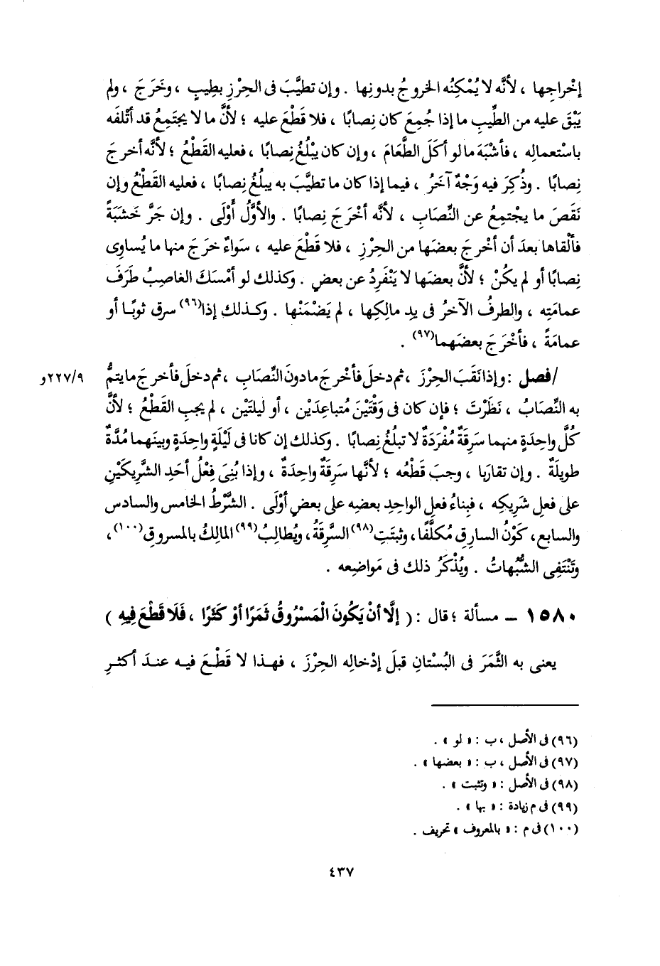 فصل: وإذا نَقَبَ الحِرْزَ، ثم دخلَ فأخْرجَ ما دونَ النِّصَابِ، ثم دخلَ فأخرجَ ما يتمُّ به النِّصَابُ، نَظَرْتَ؛ فإن كان في وَقْتَيْنَ مُتباعِدَيْن، أو ليلتَيْن، لم يجبِ القَطْعُ؛ لأنَّ كُلَّ واحِدَةٍ منهما سَرِقَةٌ مُفْرَدَةٌ لا تبلُغُ نِصابًا. وكذلك إن كانا في لَيْلَةٍ واحِدَةٍ وبينَهما مُدَّةٌ طويلَةٌ. وإن تقارَبا، وجب قَطْعُه؛ لأنَّها سَرِقَةٌ واحِدَةٌ، وإذا بُنِىَ فِعْلُ أحَدِ الشَّرِيكَيْنِ على فعلِ شَرِيكِه، فبِناءُ فعلِ الواحِدِ بعضِه على بعضٍ أوْلَى. الشَّرْطُ الخامس والسادس والسابع، كَوْنُ السارِقِ مُكلَّفًا، وثبتَتِ (٩٨) السَّرِقَةُ، ويُطالِبُ (٩٩) المالِكُ بالمسروقِ (١٠٠)، وتَنْتَفِى الشُّبُهاتُ. ويُذْكَرُ ذلك في مَواضِعه.