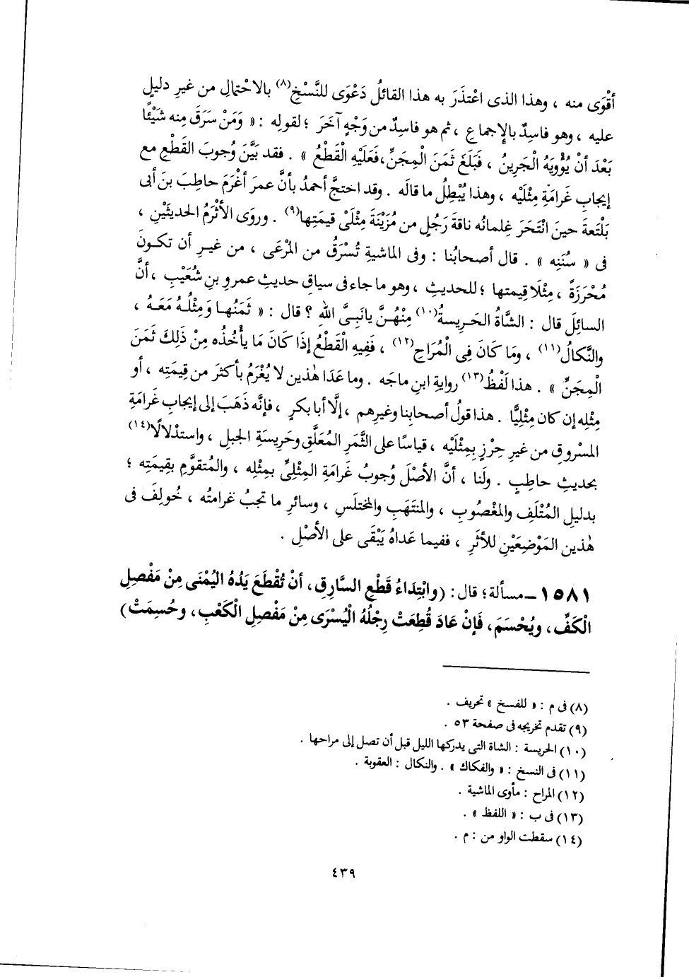 أقْوَى منه، وهذا الذي اعْتذَرَ به هذا القائلُ دَعْوَى للنَّسْخِ (٨) بالاحْتمالِ من غيرِ دليلٍ عليه، وهو فاسِدٌ بالإِجماعِ، ثم هو فاسِدٌ من وَجْهٍ آخَرَ؛ لقولِه: "وَمَنْ سَرَقَ مِنه شَيْئًا بَعْدَ أنْ يُؤْويَهُ الْجَرِينُ، فَبَلَغَ ثَمَنَ الْمِجَنِّ، فَعَلَيْهِ الْقَطْعُ". فقد بَيَّنَ وُجوبَ القَطْعِ مع إيجاب غَرامَةِ مِثْلَيْه، وهذا يُبْطِلُ ما قالَه. وقد احتجَّ أحمدُ بأنَّ عمرَ أغْرَمَ حاطِبَ بنَ أبى بَلْتَعةَ حينَ انْتَحَرَ غِلمانُه ناقةَ رَجُلٍ من مُزَيْنَةَ مِثْلَىْ قيمَتِها (٩). وروَى الأثْرَمُ الحديثَيْنِ، في "سُنَنِه". قال أصحابُنا: وفى الماشيةِ تُسْرَقُ من المرْعَى، من غيرِ أن تكونَ مُحْرَزَةً، مِثْلَا قيمتها؛ للحديثِ، وهو ما جاء في سياقِ حديثِ عمروِ بنِ شُعَيْبِ، أنَّ السائِلَ قال: الشَّاةُ الحَرِيسةُ (١٠) مِنْهُنَّ يا نَبِىَّ اللهِ؟ قال: "ثَمَنُها وَمِثْلُهُ مَعَهُ، والنَّكالُ (١١)، ومَا كَانَ في الْمُرَاحِ (١٢)، فَفِيهِ الْقَطْعُ إذَا كَانَ مَا يأْخُذُه مِنْ ذَلِكَ ثَمَنَ الْمِجَنِّ". هذا لَفْظُ (١٣) روايةِ ابنِ ماجَه. وما عَدَا هذين لا يُغْرَمُ بأكثرَ من قِيمَتِه، أو مِثْلِه إن كان مِثْلِيًّا. هذا قولُ أصحابِنا وغيرِهم، إلَّا أبا بكرٍ، فإنَّه ذَهَبَ إلى إيجابِ غَرامَةِ المسْروقِ من غيرِ حِرْزٍ بِمِثْلَيْه، قياسًا على الثَّمَرِ المُعَلَّقِ وحَرِيسَةِ الجبلِ، واستدْلالًا (١٤) بحديثِ حاطِبٍ. ولَنا، أنَّ الأصْلَ وُجوبُ غَرامَةِ المِثْلِىِّ بمِثْلِه، والمُتقوَّمِ بقِيمَتِه؛ بدليلِ المُتْلَفِ والمغْصُوبِ، والمنتَهَبِ والمختلَسِ، وسائرِ ما تجبُ غرامتُه، خُولِفَ في هذين المَوْضِعَيْنِ للأثَرِ، ففيما عَداهُ يَبْقَى على الأصْلِ.