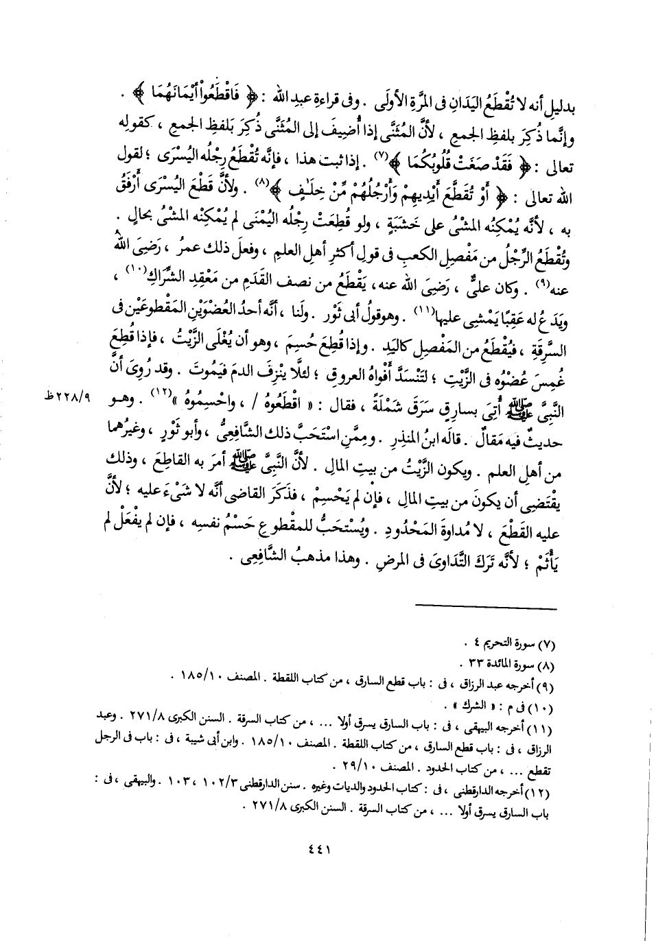 بدليلِ أنه لا تُقْطَعُ اليَدَانِ في المرَّةِ الأولَى. وفى قراءةِ عبدِ اللَّه: (فَاقْطَعُوْا أيْمَانَهُمَا). وإنَّما ذُكِرَ بلفظِ الجمعِ، لأنَّ المُثَنَّى إذا أُضِيفَ إلى المُثَنَّى ذُكِرَ بَلفظِ الجمعِ، كقولِه تعالى: {فَقَدْ صَغَتْ قُلُوبُكُمَا} (٧). إذا ثبت هذا، فإنَّه تُقْطَعُ رِجْلُه اليُسْرَى؛ لقول اللَّه تعالى: {أَوْ تُقَطَّعَ أَيْدِيهِمْ وَأَرْجُلُهُمْ مِنْ خِلَافٍ} (٨). ولأنَّ قَطْعَ اليُسْرَى أَرْفَقُ به، لأنَّه يُمْكِنُه المشْىُ على خَشَبَةٍ، ولو قُطِعَتْ رِجْلُه اليُمْنَى لم يُمْكِنْه المشْىُ بحالٍ. وتُقْطَعُ الرِّجْلُ من مَفْصِلِ الكعبِ في قولِ أكثرِ أهلِ العلمِ، وفعلَ ذلك عمرُ، رَضِىَ اللهُ عنه (٩). وكان علىٌّ، رَضِىَ اللَّه عنه، يَقْطَعُ من نصف القَدَمِ من مَعْقِدِ الشِّرَاكِ (١٠)، ويَدَعُ له عَقِبًا يَمْشِى عليها (١١). وهو قولُ أبى ثَوْر. ولَنا، أنَّه أحدُ العُضْوَيْنِ المَقْطوعَيْن في السَّرِقَةِ، فيُقْطَعُ من المَفْصِلِ كاليَدِ. وإذا قُطِعَ حُسِمَ، وهو أن يُغْلَى الزَّيْتُ، فإذا قُطِعَ غُمِسَ عُضْوُه في الزَّيْتِ؛ لتَنْسَدَّ أَفْواهُ العروقِ؛ لئلَّا ينْزِفَ الدمَ فيَمُوتَ. وقد رُوِىَ أنَّ النَّبِىَّ -صلى اللَّه عليه وسلم- أُتِىَ بسارِقٍ سَرَقَ شَمْلَةً، فقال: "اقْطَعُوهُ، واحْسِمُوهُ" (١٢). وهو حديثٌ فيه مَقالٌ. قالَه ابنُ المنذِرِ. ومِمَّنِ اسْتَحَبَّ ذلك الشَّافِعِىُّ، وأبو ثَوْرٍ، وغيرُهما من أهلِ العلم. ويكون الزَّيْتُ من بيتِ المالِ. لأنَّ النَّبِىَّ -صلى اللَّه عليه وسلم- أمرَ به القاطِعَ، وذلك يقْتَضِى أن يكونَ من بيتِ المالِ، فإن لم يَحْسِمْ، فذَكَرَ القاضي أنَّه لا شَىْءَ عليه؛ لأنَّ عليه القَطْعَ، لا مُداوةَ المَحْدُودِ. ويُسْتحَبُّ للمقْطوعِ حَسْمُ نفسِه، فإن لم يفْعَلْ لم يَأْثَمْ؛ لأنَّه تَرَكَ التَّدَاوىَ في المرضِ. وهذا مذهبُ الشَّافِعِى.