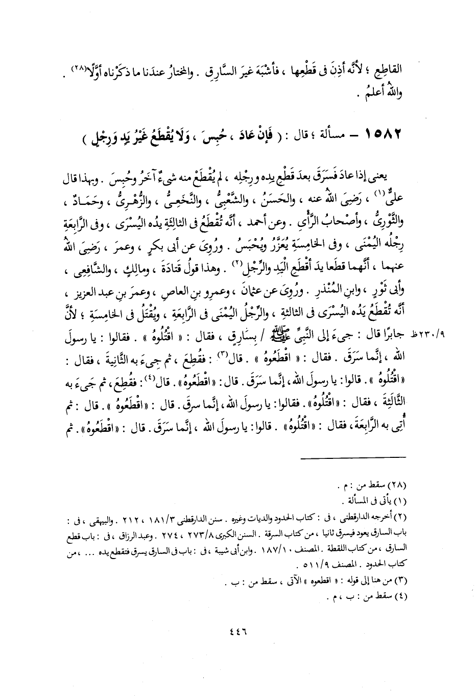 (٢) أخرجه الدارقطني، في: كتاب الحدود والديات وغيره. سنن الدارقطني ٣/ ١٨١، ٢١٢. والبيهقي، في: باب السارق يعود فيسرق ثانيا، من كتاب السرقة. السنن الكبرى ٨/ ٢٧٣، ٢٧٤. وعبد الرزاق، في: باب قطع السارق، من كتاب اللقطة. المصنف ١٠/ ١٨٧. وابن أبي شيبة، في: باب في السارق يسرق فتقطع يده. . ., من كتاب الحدود. المصنف ٩/ ٥١١.