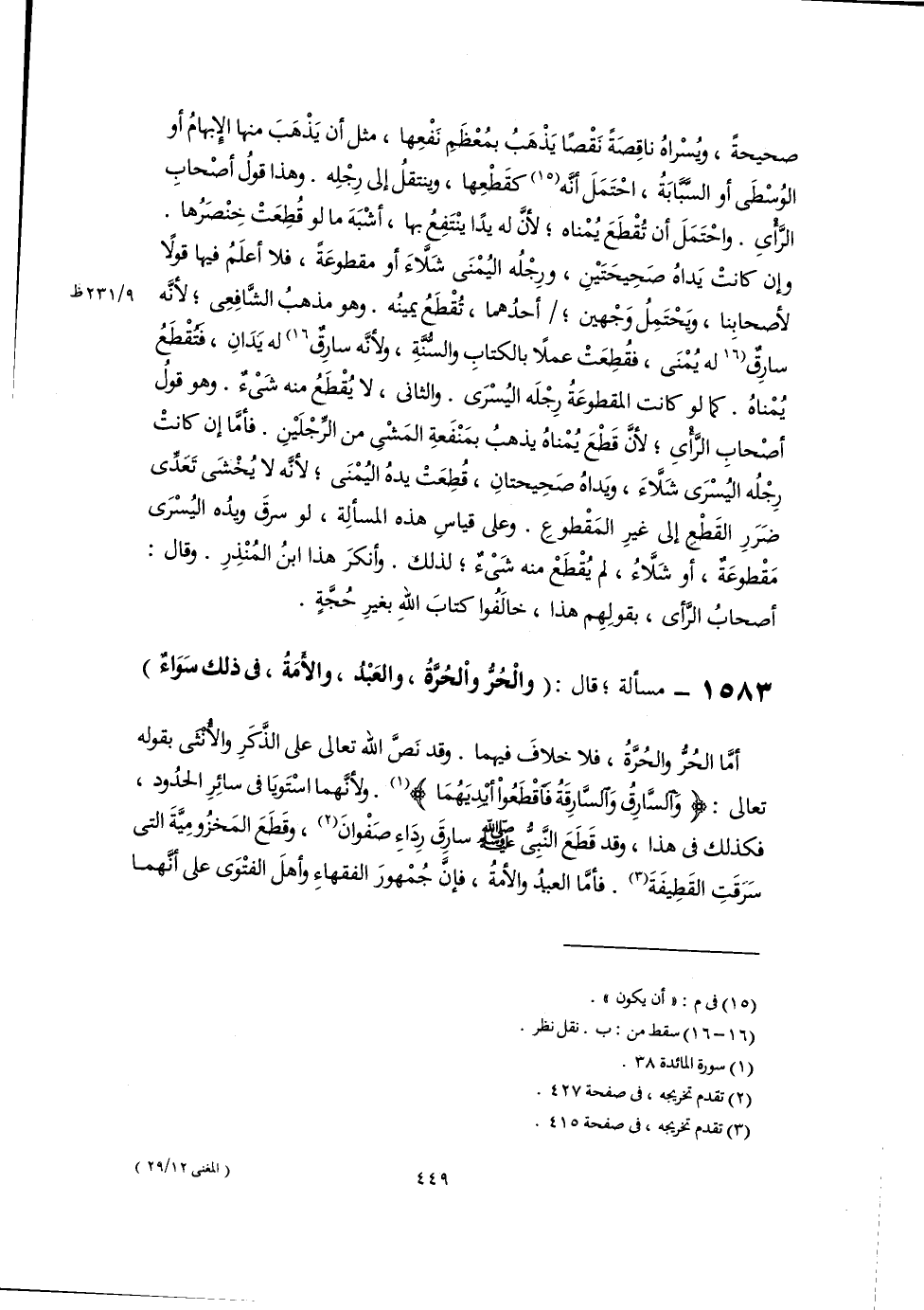 صحيحةً، ويُسْراهُ ناقِصَةً نَقْصًا يَذْهَبُ بمُعْظَمِ نَفْعِها، مثل أن يَذْهَبَ منها الإِبهامُ أو الوُسْطَى أو السَّبَّابَةُ، احْتَمَلَ أنَّه (١٥) كقَطْعِها، وينتقلُ إلى رِجْلِه. وهذا قولُ أصْحابِ الرَّأْىِ. واحْتَمَلَ أن تُقْطَعَ يُمْناه؛ لأنَّ له يدًا ينْتَفِعُ بها، أشْبَهَ ما لو قُطِعَتْ خِنْصَرُها. وإن كانتْ يَداهُ صَحِيحَتَيْنِ، ورِجْلُه اليُمْنَى شَلَّاءَ أو مقطوعَةً، فلا أعلَمُ فيها قولًا لأصحابِنا، ويَحْتَمِلُ وَجْهين؛ أحدُهما، تُقْطَعُ يمينُه. وهو مذهبُ الشَّافِعِى؛ لأنَّه سارِقٌ [له يُمْنَى، فقُطِعَتْ عملًا بالكتابِ والسُّنَّةِ، ولأنَّه سارِقٌ] (١٦) له يَدَانِ، فَتُقْطَعُ يُمْناهُ. كما لو كانت المقطوعَةُ رِجْلَه اليُسْرَى. والثانى، لا يُقْطَعُ منه شَىْءٌ. وهو قولُ أصْحابِ الرَّأْىِ؛ لأنَّ قَطْعَ يُمْناهُ يذهبُ بمَنْفَعةِ المَشْىِ من الرِّجْلَيْنِ. فأمَّا إن كانتْ رِجْلُه اليُسْرَى شَلَّاءَ، ويَداهُ صَحِيحتانِ، قُطِعَتْ يدهُ اليُمْنَى؛ لأنَّه لا يُخْشَى تَعَدِّى ضَرَرِ القَطْعِ إلى غيرِ المَقْطوعِ. وعلى قياسِ هذه المسألِة، لو سرقَ ويدُه اليُسْرَى مَقْطوعَةٌ، أو شَلَّاءُ، لم يُقْطَعْ منه شَىْءٌ؛ لذلك. وأنكرَ هذا ابنُ المُنْذِرِ. وقال: أصحابُ الرَّأى، بقولِهِم هذا، خالَفُوا كتابَ اللهِ بغيرِ حُجَّةٍ.