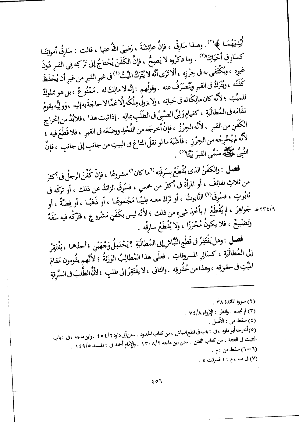 أَيْدِيَهُمَا} (٢). وهذا سَارِقٌ، فإنَّ عائِشَةَ، رَضِيَ اللهُ عنها، قالت: سَارِقُ أمواتِنَا كسَارِقِ أحْيَائِنَا (٣). وما ذكرُوه لا يَصِحُّ، فإنَّ الكَفَنَ يُحْتاجُ إلى تَرْكِه في القبرِ دُونَ غيرِه، ويُكْتَفَى به في حِرْزِه، ألَا تَرَى أنَّه لا يُتْرَكُ الميِّتُ (٤) في غيرِ القبرِ من غيرِ أن يُحْفَظَ كَفَنُه، ويُتْرَكُ في القبرِ ويُنْصَرَفُ عنه. وقولُهم: إنَّه لا مالِكَ له. مَمْنُوعٌ، بل هو مملوكٌ للميِّتِ؛ لأنَّه كان مالِكًا له في حَياتِه، ولا يزولُ مِلْكُه إلَّا عَمَّا لا حاجَةَ به إليه، وَولِيُّه يقومُ مَقَامَه في المُطالَبَةِ، كقيامِ وَلِىِّ الصَّبِىِّ في الطَلَبِ بمالِه. إذا ثبت هذا، فلا بُدَّ من إخْراجِ الكَفَنِ من القبرِ، لأنَّه الحِرْزُ، فإنْ أخرجَه من اللَّحْدِ ووضَعَه في القبرِ، فلا قَطْعَ فيه؛ لأنَّه لم يُخْرِجْه من الحِرْزِ، فأشْبَهَ ما لو نقلَ المتاعَ في البيتِ من جانبٍ إلى جانبٍ، فانَّ النَّبِىَّ -صلى اللَّه عليه وسلم- سَمَّى القبرَ بَيْتًا (٥).