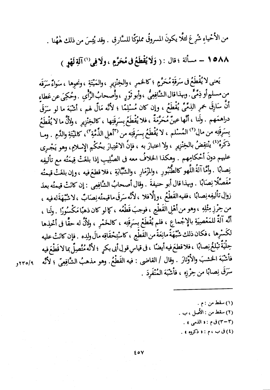 يَعنى لا يُقْطَعُ في سَرقَةِ مُحَرَّمٍ؛ كالخمرِ، والخِنْزِيرِ، والمَيْتَةِ، ونحوِها، سَواءٌ سَرَقَه من مسلمٍ أو ذِمِّىٍّ. وبهذا قال الشَّافِعِىُّ، وأبو ثَوْرٍ، وأصحابُ الرَّأْىِ. وحُكِىَ عن عَطاءٍ أنَّ سَارِقَ خمرِ الذِمِّىِّ يُقْطَعُ، وإن كان مُسْلِمًا؛ لأنَّه مَالٌ لهم، أشْبَهَ ما لو سَرَقَ دراهمَهم. ولَنا، أنَّها عينٌ مُحَرَّمَةٌ، فلا يُقْطَعُ بِسَرِقَتِها، كالخِنْزِيرِ، ولأنَّ ما لا يُقْطَعُ بِسَرِقَتِه من مالِ (٢) المُسْلم، لا يُقْطَعُ بِسَرِقَتِه من [أهلِ الذِّمَّةِ] (٣)، كالميْتَةِ والدَّمِ. وما ذكَرهُ (٤) ينْتقِضُ بالخِنْزِيرِ، ولا اعتبارَ به، فإنَّ الاعْتِبارَ بحُكْمِ الإِسلامِ، وهو يَجْرِى عليهم دونَ أحْكامِهم. وهكذا الخلافُ معه في الصَّلِيبِ إذا بلغَتْ قِيمَتُه مع تأليفِه نِصابًا. وأمَّا آلةُ اللَّهو كالطُّنْبُورِ، والمزْمَارِ، والشَّبَّابَةِ، فلا قطعَ فيه، وإن بلغَتْ قيمتُه مُفَصَّلًا نِصَابًا. وبهذا قال أبو حنيفةَ. وقال أصحابُ الشَّافِعِى: إن كانَتْ قيمتُه بعدَ زوالِ تأليفِه نِصابًا، ففيه القَطْعُ، وإلَّا فلا، لأنَّه سَرقَ ما قيمتُه نِصَابٌ، لا شُبْهَةَ له فيه، من حِرْزِ مِثْلِهِ، وهو من أهْلِ القَطْعِ، فوجبَ قَطْعُه، كما لو كان ذهبًا مَكْسُورًا. ولَنا، أنَّه آلةٌ للمَعْصِيَةِ بالإِجْماعِ، فلم يُقْطَعْ بِسَرِقَتِه، كالخَمْرِ، ولأنَّ له حقًّا في أخْذِها لكَسْرِها، فكان ذلك شُبْهَةً مانِعَةً من القَطْعِ، كاسْتِحْقَاقِه مالَ ولدِه. فإن كانَتْ عليه حِلْيَةٌ تبْلغُ نِصابًا، فلا قطعَ فيه أيضًا، في قياسِ قولِ أبى بكرٍ؛ لأنَّه مُتَّصِلٌ بما لا قَطْعَ فيه فأشْبَهَ الخشبَ والأوْتارَ. وقال القاضي: فيه القَطْعُ. وهو مذهبُ الشَّافِعِىّ؛ لأنَّه سَرَقَ نِصابًا من حِرْزِه، فأشْبَهَ المُنْفَرِدَ.