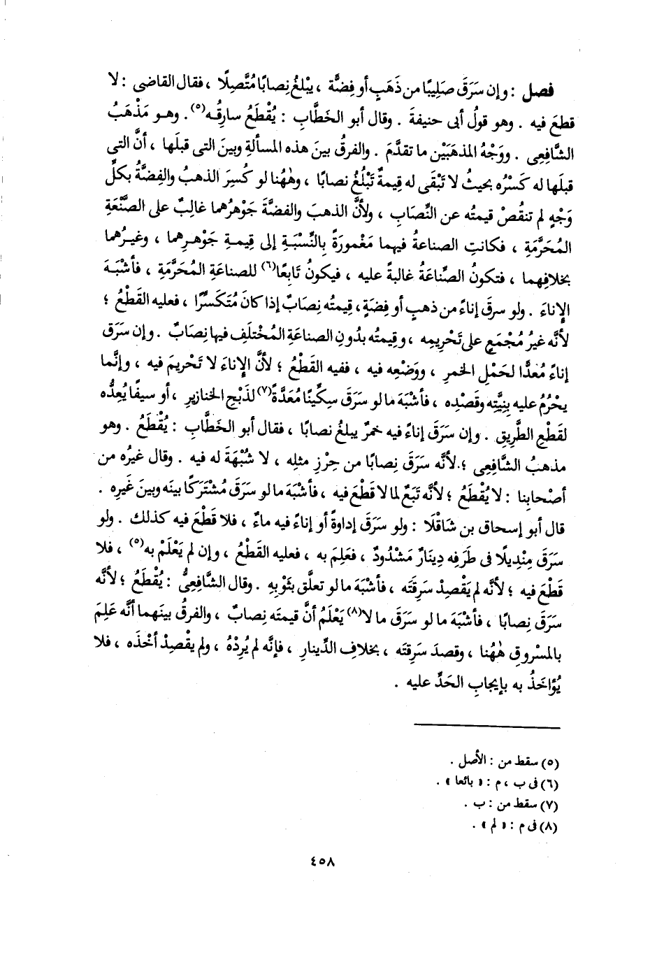 فصل: وإن سَرَقَ صَلِيبًا من ذَهَبٍ أو فِضًّة، يبْلغُ نِصابًا مُتَّصِلًا، فقال القاضي: لا قطعَ فيه. وهو قولُ أبى حنيفةَ. وقال أبو الخَطَّابِ: يُقْطَعُ سارِقُه (٥). وهو مَذْهَبُ الشَّافِعِى. ووَجْهُ المذهَبَيْن ما تقدَّمَ. والفرقُ بينَ هذه المسألةِ وبينَ التي قبلَها، أنَّ التي قبلَها له كَسْرُه بحيثُ لا تَبْقَى له قِيمةٌ تَبْلُغُ نصابًا، وههُنا لو كُسِرَ الذهبُ والفِضَّةُ بكلِّ وَجْهٍ لم تنقُصْ قيمتُه عن النِّصَابِ، ولأنَّ الذهبَ والفضَّةَ جَوْهرُهما غالِبٌ على الصَّنْعَةِ المُحَرَّمَةِ، فكانتِ الصناعةُ فيهما مَغْمورَةً بِالنِّسْبَةِ إلى قِيمةِ جَوْهرِهما، وغيرُهما بخلافِهما، فتكونُ الصِّناعَةُ غالبةً عليه، فيكونُ تَابِعًا (٦) للصناعَةِ المُحَرَّمَةِ، فأشْبَهَ الإِناءَ. ولو سرقَ إناءً من ذهبٍ أو فِضَةٍ، قِيمتُه نِصَابٌ إذا كانَ مُتَكَسِّرًا، فعليه القَطْعُ؛ لأنَّه غيرُ مُجْمَعٍ على تَحْرِيمِه، وقِيمتُه بدُونِ الصناعَةِ المُخْتلَفِ فيها نِصَابٌ. وإن سَرَق إناءً مُعدًّا لحَمْلِ الخمرِ، ووَضْعِه فيه، ففيه القَطْعُ؛ لأنَّ الإِناءَ لا تَحْريمَ فيه، وإنَّما يحْرُمُ عليه بِنِيَّتِه وقَصْدِه، فأشْبَهَ ما لو سَرَقَ سِكِّينًا مُعَدَّةً (٧) لذَبْحِ الخنازيرِ، أو سيفًا يُعِدُّه لقَطْعِ الطَّرِيقِ. وإن سَرَقَ إناءً فيه خمرٌ يبلغُ نصابًا، فقال أبو الخَطَّابِ: يُقْطَعُ. وهو مذهبُ الشَّافِعِى؛ لأنَّه سَرَقَ نِصابًا من حِرْزِ مثلِه، لا شُبْهَةَ له فيه. وقال غيرُه من أصْحابِنا: لا يُقْطَعُ؛ لأنَّه تَبَعٌ لما لا قَطْعَ فيه، فأشْبَهَ ما لو سَرَقَ مُشْتَرَكًا بينَه وبينَ غَيرِه. قال أبو إسحاق بن شَاقْلَا: ولو سَرَقَ إداوةً أو إناءً فيه ماءٌ، فلا قَطْعَ فيه كذلك. ولو سَرَقَ مِنْدِيلًا في طَرَفِه دِينَارٌ مَشْدُودٌ، فعَلِمَ به، فعليه القَطْعُ، وإن لم يَعْلَمْ به (٥)، فلا قَطْعَ فيه؛ لأنَّه لم يَقْصِدْ سَرِقَتَه، فأشْبَهَ ما لو تعلَّق بثَوْبِهِ. وقال الشَّافِعِىُّ: يُقْطَعُ؛ لأنَّه سَرَقَ نِصابًا، فأشْبَهَ ما لو سَرَقَ ما لا (٨) يَعْلَمُ أنَّ قيمتَه نِصابٌ، والفرقُ بينَهما أنَّه عَلِمَ بالمسْروقِ ههُنا، وقصدَ سَرِقتَه، بخلافِ الدِّينارِ، فإنَّه لم يُرِدْهُ، ولم يقْصِدْ أخْذَه، فلا يُؤاخَذُ به بإيجابِ الحَدِّ عليه.