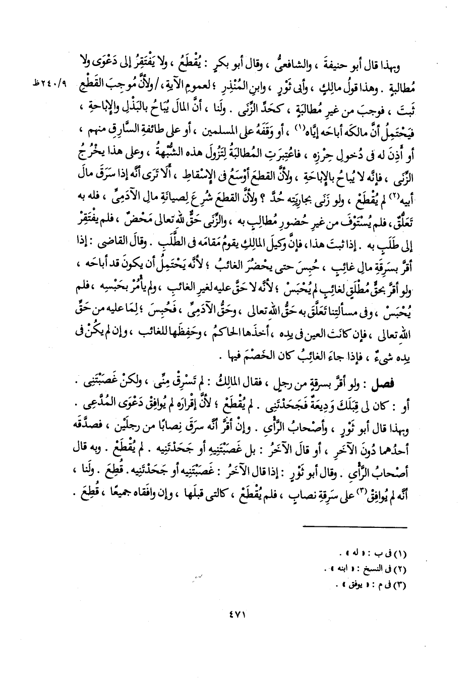 وبهذا قال أبو حنيفةَ، والشافعيُّ، وقال أبو بكرٍ: يُقْطَعُ، ولا يَفْتَقِرُ إلى دَعْوَى ولا مُطالبةٍ. وهذا قولُ مالِكٍ، وأبى ثَوْرٍ، وابنِ المُنْذِرِ؛ لعمومِ الآيةِ، ولأنَّ مُوجِبَ القَطْعِ ثَبتَ، فوجبَ من غيرِ مُطالبَةٍ، كحَدِّ الزِّنَى. ولَنا، أنَّ المالَ يُبَاحُ بالبَذْلِ والإِباحةِ، فيَحْتَمِلُ أنَّ مالكَه أباحَه إيَّاه (١)، أو وَقَفَهُ على المسلمين، أو على طائفةِ السَّارِقِ منهم، أو أَذِنَ له في دُخولِ حِرْزِه، فاعتُبِرَتِ المُطالبَةُ لِتَزُولَ هذه الشُّبْهةُ، وعلى هذا يخْرُجُ الزِّنَى، فإنَّه لا يُباحُ بالإِباحَةِ، ولأنَّ القطعَ أوْسَعُ في الإِسْقاطِ، أَلَا تَرَى أنَّه إذا سَرَقَ مالَ أبيه (٢) لم يُقْطَعْ، ولو زَنَى بجارِيَتِه حُدَّ؟ ولأنَّ القطعَ شُرِعَ لِصيانَةِ مالِ الآدَمِىِّ، فله به تَعَلُّقٌ، فلم يُسْتَوْفَ من غيرِ حُضورِ مُطالِبٍ به، والزِّنَى حَقٌّ للَّه تعالى مَحْضٌ، فلم يفْتَقِرْ إلى طَلَبٍ به. إذا ثبتَ هذا، فإنَّ وكيلَ المالِكِ يقومُ مَقامَه في الطَّلَبِ. وقالَ القاضي: إذا أقرَّ بسَرِقَةِ مالِ غائِبٍ، حُبِسَ حتى يحْضُرَ الغائبُ؛ لأنَّه يَحْتَمِلُ أن يكونَ قد أباحَه، ولو أقرَّ بحقٍّ مُطْلَقٍ لغائِبٍ لم يُحْبَسْ؛ لأنَّه لا حَقَّ عليه لغيرِ الغائبِ، ولم يأْمُرْ بحَبْسِه، فلم يُحْبَسْ، وفي مسألتِنا تَعَلَّقَ به حَقُّ اللَّه تعالى، وحَقُّ الآدَمِىِّ، فَحُبِسَ؛ لِمَا عليه من حَقِّ اللهِ تعالى، فإن كانَت العين في يدِه، أَخذَها الحاكمُ، وحَفِظَها للغائب، وإن لم يكُنْ في يدِه شيءٌ، فإذا جاءَ الغائِبُ كان الخَصْمَ فيها.