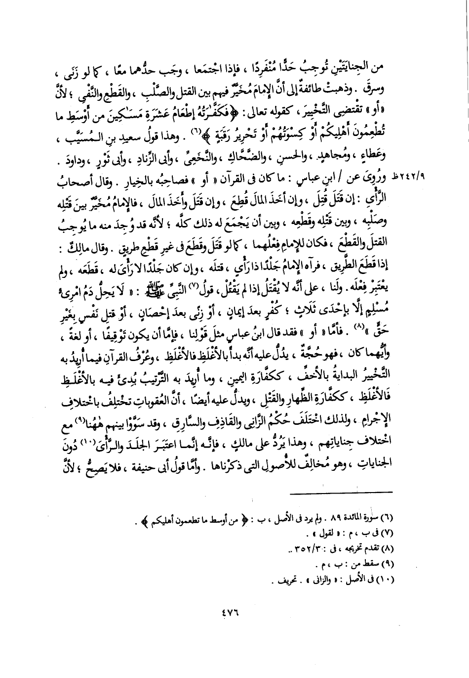 من الجِنايَتَيْنِ تُوجِبُ حَدًّا مُنْفَرِدًا، فإذا اجْتمَعا، وجَب حدُّهما معًا، كما لو زَنَى، وسرقَ. وذهبتْ طائفةٌ إلى أنَّ الإِمامَ مُخَيَّرٌ فيهم بين القتل والصَّلْبِ، والقَطْعِ والنَّفْىِ؛ لأنَّ "أو" تقْتضِى التَّخْيِيرَ، كقوله تعالى: {فَكَفَّارَتُهُ إِطْعَامُ عَشَرَةِ مَسَاكِينَ مِنْ أَوْسَطِ مَا تُطْعِمُونَ أَهْلِيكُمْ أَوْ كِسْوَتُهُمْ أَوْ تَحْرِيرُ رَقَبَةٍ} (٦). وهذا قولُ سعيدِ بنِ المُسَيَّب، وعَطاءٍ، ومُجاهدٍ، والحسنِ، والضَّحَّاكِ، والنَّخَعِىِّ، وأبى الزِّنادِ، وأبى ثَوْرٍ، وداودَ. ورُوِىَ عن ابنِ عباسٍ: ما كان في القرآن "أو" فصاحِبُه بالخِيارِ. وقال أصحابُ الرَّأْىِ: إن قَتَلَ قُتِلَ، وإن أخَذَ المالَ قُطِعَ، وإن قَتَلَ وأَخَذَ المالَ، فالإِمامُ مُخَيَّرٌ بينَ قَتْلِه وصَلْبِه، وبين قَتْلِه وقَطْعِه، وبين أن يَجْمَعَ له ذلك كلَّه؛ لأنَّه قد وُجِدَ منه ما يُوجِبُ القتلَ والقَطْعَ، فكان للإِمامِ فِعْلُهما، كما لو قَتَلَ وقَطَعَ في غيرِ قَطْعِ طريقٍ. وقال مالِكٌ: إذا قَطَعَ الطَّرِيق، فرآه الإِمامُ جَلْدًا ذا رَأْىٍ، قتلَه، وإن كان جَلْدًا لا رَأْىَ له، قَطَعَه، ولم يعْتَبِرْ فِعْلَه. ولَنا، على أنَّه لا يُقْتَلُ إذا لم يَقْتُلْ، قولُ (٧) النَّبِيِّ -صلى اللَّه عليه وسلم-: "لَا يَحِلُّ دَمُ امْرِئٍ مُسْلِمٍ إلَّا بإحْدَى ثَلَاثٍ؛ كُفْرٍ بعدَ إيمانٍ، أوْ زِنًى بعدَ إحْصَانٍ، أوْ قتلِ نَفْسٍ بِغَيْرِ حَقٍّ" (٨). فأمَّا "أو" فقد قال ابنُ عباسٍ مثلَ قَوْلِنا، فإمَّا أن يكون تَوْقِيفًا، أو لغةً، وأيُّهما كان، فهو حُجَّةٌ، يدُلُّ عليه أنَّه بدأَ بالأغْلَظِ فالأغْلَظِ، وعُرْفُ القرآنِ فيما أُرِيدُ به التَّخْييرُ البدايةُ بالأخفِّ، ككفَّارَةِ اليمينِ، وما أُرِيدَ به التَّرْتيبُ بُدِئَ فيه بالأغْلَظِ فَالأغْلَظِ، ككفَّارَةِ الظِّهارِ والقَتْلِ، ويدلُّ عليه أيضًا، أنَّ العُقوباتِ تخْتلِفُ باخْتلافِ الإِجْرامِ، ولذلك اخْتَلَفَ حُكْمُ الزَّانِى والقَاذِفِ والسَّارِقِ، وقد سَوَّوْا بينهم ههُنا (٩) مع اخْتلاف جِناياتِهم، وهذا يَرُدُّ على مالكٍ، فإنَّه إنَّما اعتَبَرَ الجلَدَ والرَّأْىَ (١٠) دُونَ الجناياتِ، وهو مُخالِفٌ للأُصولِ التي ذكرْناها. وأمَّا قولُ أبى حنيفة، فلا يَصِحُّ؛ لأنَّ