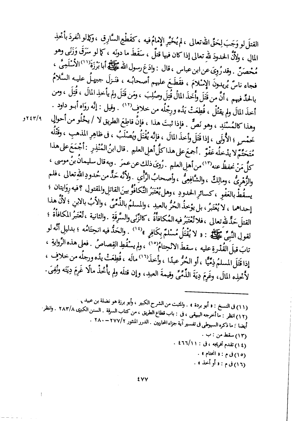 (١٢) انظر: ما أخرجه البيهقي، في: باب قطاع الطريق، من كتاب السرقة. السنن الكبرى ٨/ ٢٨٣. وانظر أيضًا: ما ذكره السيوطي في تفسير آية جزاء المحاربين. الدرر المنثور ٢/ ٢٧٧ - ٢٨٠.