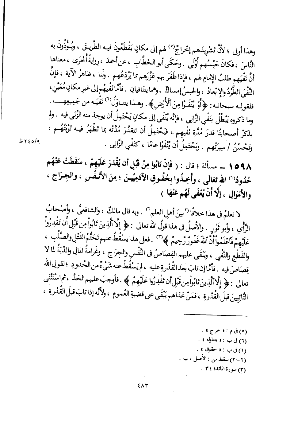 وهذا أولى؛ لأنَّ تَشْرِيدَهم إخْراجٌ (٥) لهم إلى مكانٍ يَقْطَعُونَ فيه الطَّريقَ، ويُؤْذُونَ به النَّاسَ، فكانَ حَبْسُهم أَوْلَى. وحَكَى أبو الخَطَّابِ، عن أحمدَ، رِوايةً أُخْرَى، معناها أنَّ نَفْيَهم طلبُ الإِمامِ لهم، فإذا ظَفَرَ بهم عَزَّرَهم بما يَرْدَعُهم. ولَنا، ظاهرُ الآية، فإنَّ النَّفْىَ الطَّرْدُ والإِبْعادُ، والحبسُ إمساكٌ، وهما يتنَافيانِ. فأمَّا نَفْيهُم إلى غيرِ مكانٍ مُعَيَّنٍ، فلقولِه سبحانه: {أوْ يُنْفَوْا مِنَ الْأَرْضِ}. وهذا يتناوَلُ (٦) نَفْيَه من جَمِيعِها. وما ذكروه يَبْطُل بنَفْىِ الزَّانِى، فإنَّه يُنْفَى إلى مكانٍ يَحْتَمِلُ أن يوجدَ منه الزِّنِى فيه. ولم يذكرْ أصحابُنا قدرَ مُدَّةِ نَفْيهِم، فيَحْتَمِلُ أن تتقدَّرَ مُدَّتُه بما تَظْهَرُ فيه تَوْبَتُهُم، وتَحْسُنُ سِيرَتُهم. ويَحْتَمِلُ أن يُنْفَوْا عامًا، كنَفْىِ الزَّانِى.