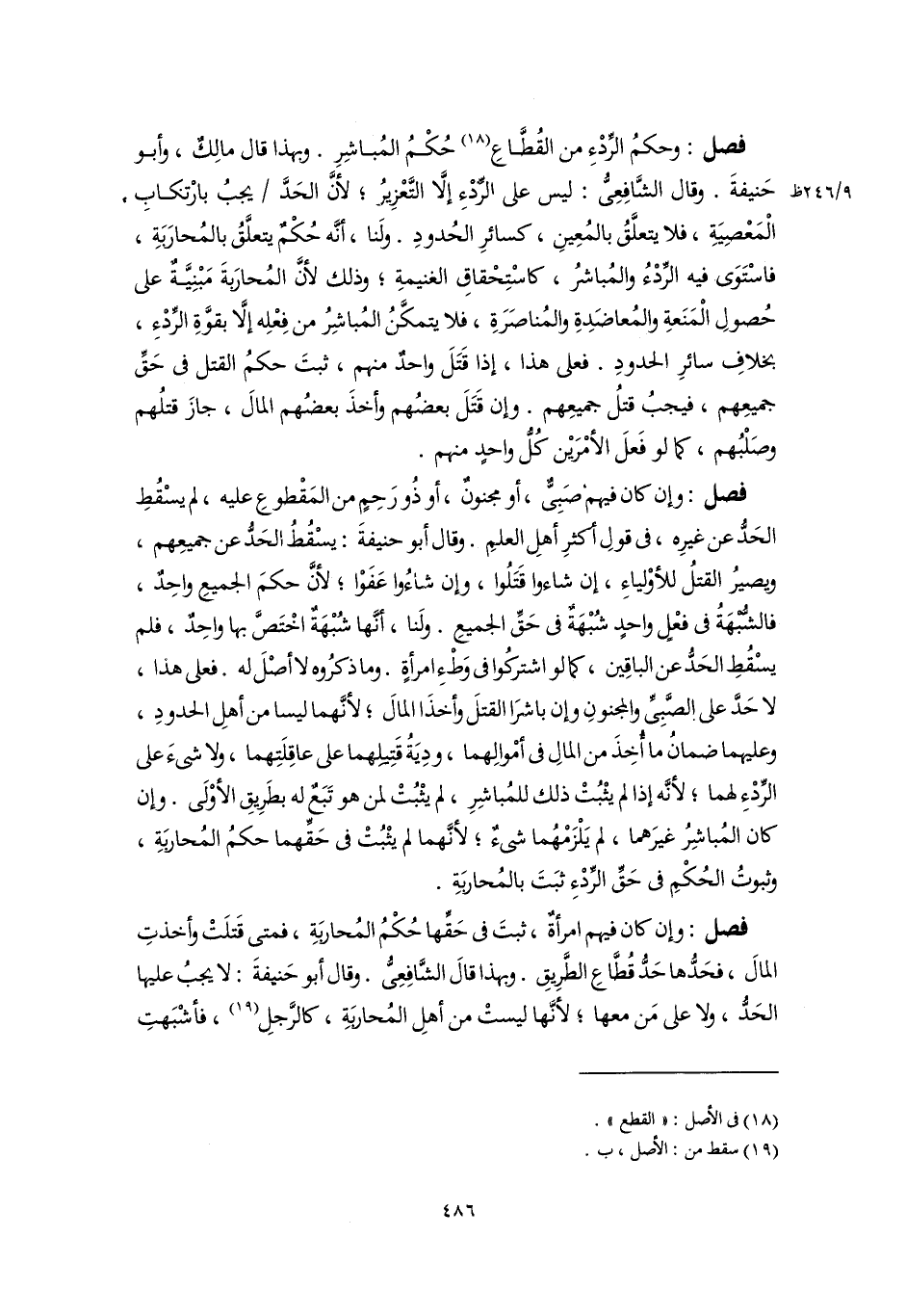 فصل: وإن كان فيهم صَبِىٌّ، أو مجنونٌ، أو ذُو رَحِمٍ من المَقْطوعِ عليه، لم يسْقُطِ الحَدُّ عن غيرِه، في قولِ أكثرِ أهلِ العلمِ. وقال أبو حنيفةَ: يسْقُطُ الحَدُّ عن جميعِهم، ويصيرُ القتلُ للأوْلياءِ، إن شاءوا قَتَلُوا، وإن شاءُوا عَفَوْا؛ لأنَّ حكمَ الجميعِ واحِدٌ، فالشُّبْهَةُ في فعْلٍ واحدٍ شُبْهَةٌ في حَقِّ الجميعِ. ولَنا، أنَّهَا شُبْهَةٌ اخْتَصَّ بها واحِدٌ، فلم يسْقُطِ الحَدُّ عن الباقِين، كما لو اشتركُوا في وَطْءِ امرأةٍ. وما ذكرُوه لا أصْلَ له. فعلى هذا، لا حَدَّ على الصَّبِىِّ والمجنونِ وإن باشَرَا القتلَ وأخذَا المالَ؛ لأنَّهما ليسا من أهلِ الحدودِ، وعليهما ضمانُ ما أُخِذَ من المالِ في أمْوالِهما، ودِيَةُ قَتِيلِهما على عاقِلَتِهما، ولا شىءَ على الرِّدْءِ لهما؛ لأنَّه إذا لم يثْبُتْ ذلك للمُباشِرِ، لم يثْبُتْ لمن هو تَبَعٌ له بطَرِيقِ الأوْلَى. وإن كان المُباشِرُ غيرَهما، لم يَلْزَمْهُما شيءٌ؛ لأنَّهما لم يثْبُتْ في حَقِّهما حكمُ المُحاربَةِ، وثبوتُ الحُكْمِ في حَقِّ الرِّدْءِ ثبَتَ بالمُحاربَةِ.