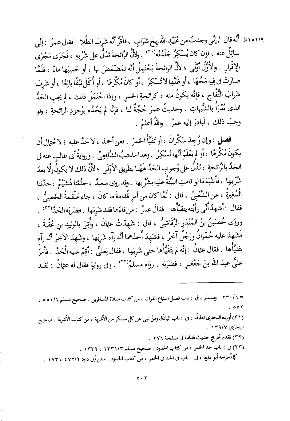 فصل: وإن وُجِدَ سَكْرانَ، أو تَقَيَّأَ الخمرَ. فعن أحمدَ، لا حَدَّ عليه؛ لاحْتمالِ أن يكونَ مُكْرهًا، أو لم يَعْلَمْ أنَّها تُسْكِرُ. وهذا مذهبُ الشَّافِعِىِّ. وروايةُ أبى طالبٍ عنه في الحَدِّ بالرَّائحةِ، تَدُلُّ على وُجوبِ الحَدِّ ههُنا بطَريقِ الأوْلَى؛ لأنَّ ذلك لا يكونُ إلَّا بعدَ شُرْبِها، فأشْبَهَ مَا لو قامتِ البَيِّنَةُ عليه بشُرْبِها. وقد روى سعيدٌ، حدَّثنا هُشَيْمٌ، حدَّثنا الْمُغِيرةُ، عن الشَّعْبِىِّ، قال: لَمَّا كان من أمرِ قُدامةَ ما كانَ، جاء عَلْقَمةُ الخَصِىُّ، فقال: أشهدُ أَنِّى رأيتُه يتقيَّأُها. فقالَ عمرُ: من قاءَها فقد شَرِبَها. فضَربَه الحَدَّ (٣٢). وروَى حُصَينُ بنُ المُنْذِرِ الرَّقَاشِىُّ، قال: شَهِدْتُ عثمانَ، وأُتِىَ بالوليدِ بنِ عُقْبةَ، فَشَهِدَ عليه حُمْرانُ ورَجُلٌ آخَرُ، فشَهِدَ أَحدُهما أنَّه رآه شَرِبَها، وشَهِدَ الآخرُ أنَّه رآه يتَقيَّأُها. فقال عثمانُ: إنَّه لم يتَقَيَّأْها حتى شَرِبَها، فقال لِعلىٍّ: أقِمْ عليه الْحَدَّ. فأمرَ علىٌّ عبدَ اللَّه بنَ جَعْفرٍ، فضَرَبَه. روَاه مسلمٌ (٣٣). وفي روايةٍ فقال له عثمانُ: لقد