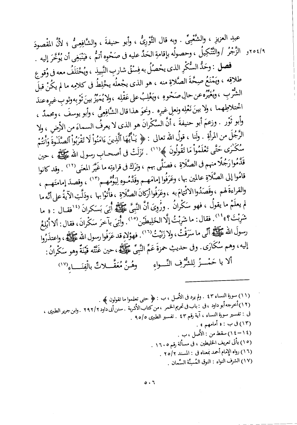 فصل: وحَدُّ السُّكْرِ الذي يحْصُلُ به فِسْقُ شاربِ النَّبِيذِ، ويُخْتَلَفُ معه في وُقوعِ طلاقِه، ويَمْنَعُ صِحَّةَ الصَّلاةِ منه، هو الذي يجْعلُه يخْلِطُ في كلامِه ما لم يكُنْ قبلَ الشُّرْبِ، ويُغَيِّرُه عن حالِ صَحْوهِ، ويَغْلِبُ على عَقْلِه، ولا يُمَيِّزُ بينَ ثَوْبِه وثوبِ غيرِه عندَ اخْتلاطِهما، ولا بينَ نَعْلِه ونعلِ غيرِه. ونحوَ هذا قال الشَّافِعِىُّ، وأبو يوسفَ، ومحمدٌ، وأبو ثَوْر. وزعمَ أبو حنيفةَ، أنَّ السَّكْرانَ هو الذي لا يعرفُ السماءَ من الأرضِ، ولا الرَّجُلَ من المرأةِ. ولَنا، قولُ اللَّه تعالى: {يَاأَيُّهَا الَّذِينَ آمَنُوا لَا تَقْرَبُوا الصَّلَاةَ وَأَنْتُمْ سُكَارَى حَتَّى تَعْلَمُوا مَا تَقُولُونَ} (١١). نَزَلَتْ في أصحابِ رسولِ اللَّه -صلى اللَّه عليه وسلم-، حين قَدَّمُوا رَجُلًا منهم في الصَّلَاةِ، فصَلَّى بهم، وترَكَ في قراءتِه ما غَيَّرَ المعنَى (١٢). وقد كانوا قامُوا إلى الصَّلَاةِ عالمين بها، وعَرَفُوا إمامَهم وقَدَّمُوه لِيَؤُمَّهم (١٣)، وقصدَ إمامتَهم، والقراءةَ لهم، وقَصَدُوا الائْتمامَ به، وعَرَفُوا أركانَ الصَّلَاةِ، فأَتَوْا بها، ودَلَّتِ الآيةُ على أنَّه ما لم يعلَمْ ما يقولُ، فهو سَكْرانُ. ورُوِىَ أنَّ النَّبِىَّ -صلى اللَّه عليه وسلم- أُتِىَ بَسَكرانَ [فقال: "ما شَرِبْتَ؟ "] (١٤). فقال: ما شَرِبْتُ إلَّا الخَلِيطَيْن (١٥). وأُتِىَ بآخرَ سَكْرانَ، فقال: ألا أَبْلِغْ رسولَ اللَّه -صلى اللَّه عليه وسلم- أنِّى ما سَرَقْتُ، ولا زَنَيْتُ (١٦). فهؤلاء قد عَرَفُوا رسول اللَّه -صلى اللَّه عليه وسلم-، واعتذَرُوا إليه، وهم سُكَارَى. وفي حديثِ حمزةَ عَمِّ النَّبِيِّ -صلى اللَّه عليه وسلم-، حين غَنَّتْه قَيْنَةٌ وهو سَكْرانُ: