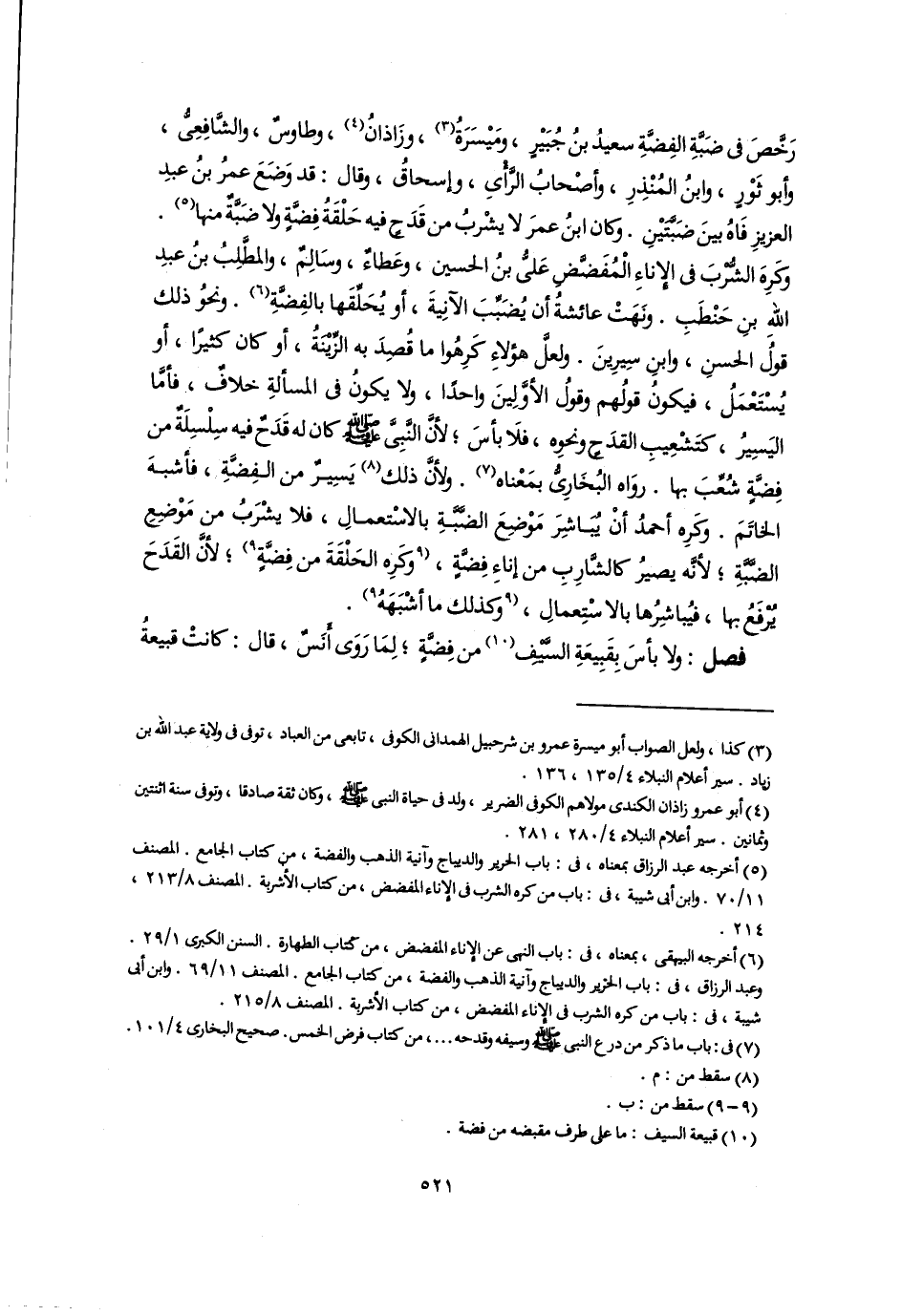 رَخَّصَ في ضَبَّةِ الفِضَّةِ سعيدُ بنُ جُبَيْرٍ، ومَيْسَرَةُ (٣)، وزَاذانُ (٤)، وطاوسٌ، والشَّافِعِىُّ، وأبو ثَوْرٍ، وابنُ المُنذِرِ، وأصْحابُ الرَّأْىِ، وإسحاقُ، وقال: قد وَضَعَ عمرُ بنُ عبدِ العزيزِ فَاهُ بينَ ضَبَّتَيْنِ. وكان ابنُ عمرَ لا يشْربُ من قَدَحٍ فيه حَلْقَةُ فِضَّةٍ ولا ضَبَّةٌ منها (٥). وكَرِهَ الشُّرْبَ في الإِناءِ الْمُفَضَّضِ عَلىُّ بنُ الحسين، وعَطاءٌ، وسَالِمٌ، والمطَّلِبُ بنُ عبدِ اللهِ بنِ حَنْطَبِ. ونَهَتْ عائشةُ أن يُضَبِّبَ الآنِيةَ، أو يُحَلِّقَها بالفِضَّةِ (٦). ونحوُ ذلك قولُ الحسنِ، وابنِ سِيرِينَ. ولعلَّ هؤلاءِ كَرِهُوا ما قُصِدَ به الزِّيْنَةُ، أو كان كثيرًا، أو يُسْتَعْمَلُ، فيكونُ قولُهم وقولُ الأوَّلِينَ واحدًا، ولا يكونُ في المسألةِ خلافٌ، فأمَّا اليَسِيرُ، كتَشْعِيبِ القدَحِ ونحوِه، فلَا بأسَ؛ لأنَّ النَّبِىَّ -صلى اللَّه عليه وسلم- كان له قَدَحٌ فيه سِلْسِلَةٌ من فِضَّةٍ شُعِّبَ بها. روَاه البُخَارِىُّ بمَعْناه (٧). ولأنَّ ذلك (٨) يَسِيرٌ من الفِضَّةِ، فأشبهَ الخاتَمَ. وكَرِه أحمدُ أنْ يُبَاشِرَ مَوْضِعَ الضَّبَّةِ بالاسْتعمالِ، فلا يشْرَبُ من مَوْضِعِ الضَّبَّةِ؛ لأنَّه يصيرُ كالشَّارِبِ من إناءِ فِضَّةٍ، [وكَرِه الحَلْقَةَ من فِضَّةٍ] (٩)؛ لأنَّ القَدَحَ يُرْفَعُ بها، فيُباشِرُها بالاسْتِعمالِ، [وكذلك ما أشْبَهَهُ] (٩).