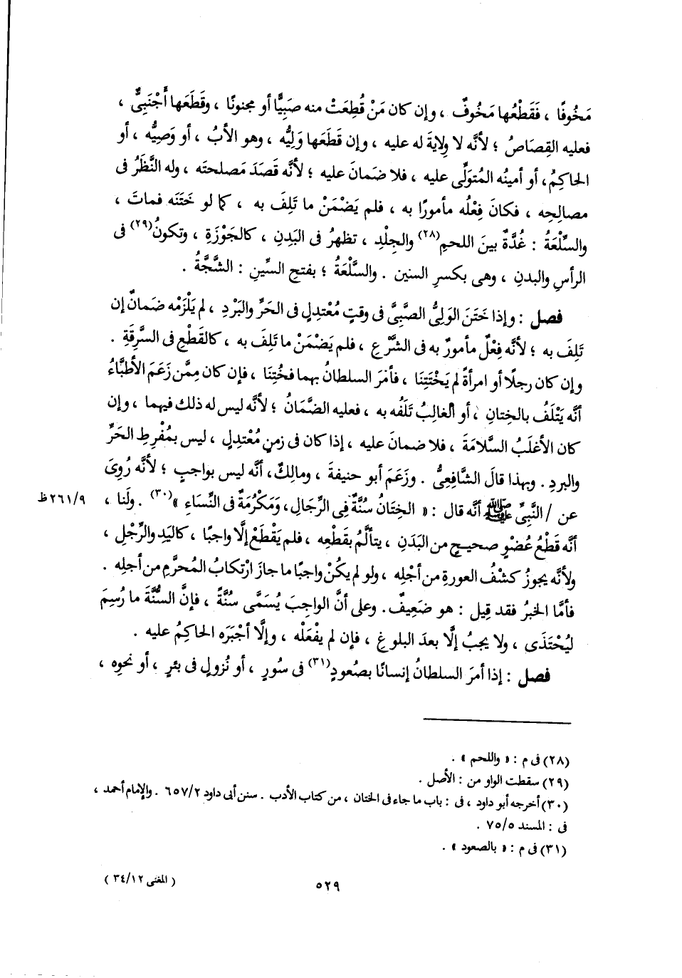 فصل: وإذا خَتَنَ الوَلِىُّ الصَّبِىَّ في وقتٍ مُعْتدِلٍ في الحَرِّ والبَرْدِ، لم يَلْزَمْه ضَمانٌ إن تَلِفَ به؛ لأنَّه فِعْلٌ مأمورٌ به في الشَّرْعِ، فلم يَضْمَنْ ما تَلِفَ به، كالقَطْعِ في السَّرِقَةِ. وإن كان رجلًا أو امرأةً لم يَخْتَتِنَا، فأمرَ السلطانُ بهما فخُتِنَا، فإن كان مِمَّن زَعَمَ الأطبَّاءُ أنَّه يَتْلَفُ بالخِتانِ، أو الغالِبُ تَلَفُه به، فعليه الضَّمَانُ؛ لأنَّه ليس له ذلك فيهما، وإن كان الأغلَبُ السَّلامَةَ، فلا ضمانَ عليه، إذا كان في زمنٍ مُعْتدِلٍ، ليس بمُفْرِطِ الحَرِّ والبردِ. وبهذا قالَ الشَّافِعِىُّ. وزَعَمَ أبو حنيفةَ، ومالِكٌ، أنَّه ليس بواجبٍ؛ لأنَّه رُوِىَ عن النَّبِيِّ -صلى اللَّه عليه وسلم- أنَّه قال: "الخِتَانُ سُنَّةٌ في الرِّجَالِ، وَمَكْرُمَةٌ في النِّسَاءِ" (٣٠). ولَنا، أنَّه قَطْعُ عُضْوٍ صحيحٍ من البَدَنِ، يتألَّمُ بقَطْعِه، فلم يَقْطَعْ إلَّا واجبًا، كاليَدِ والرِّجْلِ، ولأنَّه يجوزُ كشْفُ العورةِ من أجْلِه، ولو لم يكُنْ واجبًا ما جازَ ارْتكابُ المُحرَّمِ من أجلِه. فأمَّا الخبرُ فقد قِيل: هو ضَعِيفٌ. وعلى أنَّ الواجِبَ يُسَمَّى سُنَّةً، فإنَّ السُّنَّةَ ما رُسِمَ ليُحْتَذَى، ولا يجبُ إلَّا بعدَ البلوغِ، فإن لم يفْعَلْه، وإلَّا أجْبَرَه الحاكِمُ عليه.