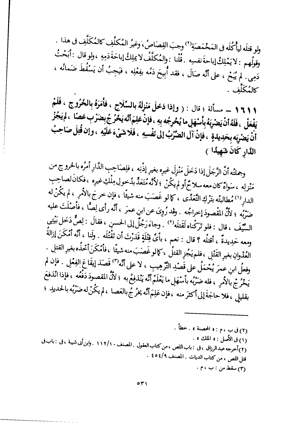ولو قتلَه ليأْكُلَه في المَخْمَصَةِ (٢) وجبَ القِصَاصُ، وغيرُ المُكلَّفِ كالمُكَلَّفِ في هذا. وقولُهم: لا يَمْلِكُ إباحةَ نفسِه. قُلْنا: والمُكلَّفُ لا يملِكُ إباحَةَ دَمِهِ، ولو قال: أبَحْتُ دَمِى. لم يُبَحْ، على أنَّه صَالَ، فقد أُبِيحَ دَمُه بفِعْلِه، فيَجِبُ أن يَسْقُطَ ضَمانُه، كالمُكَلَّفِ.