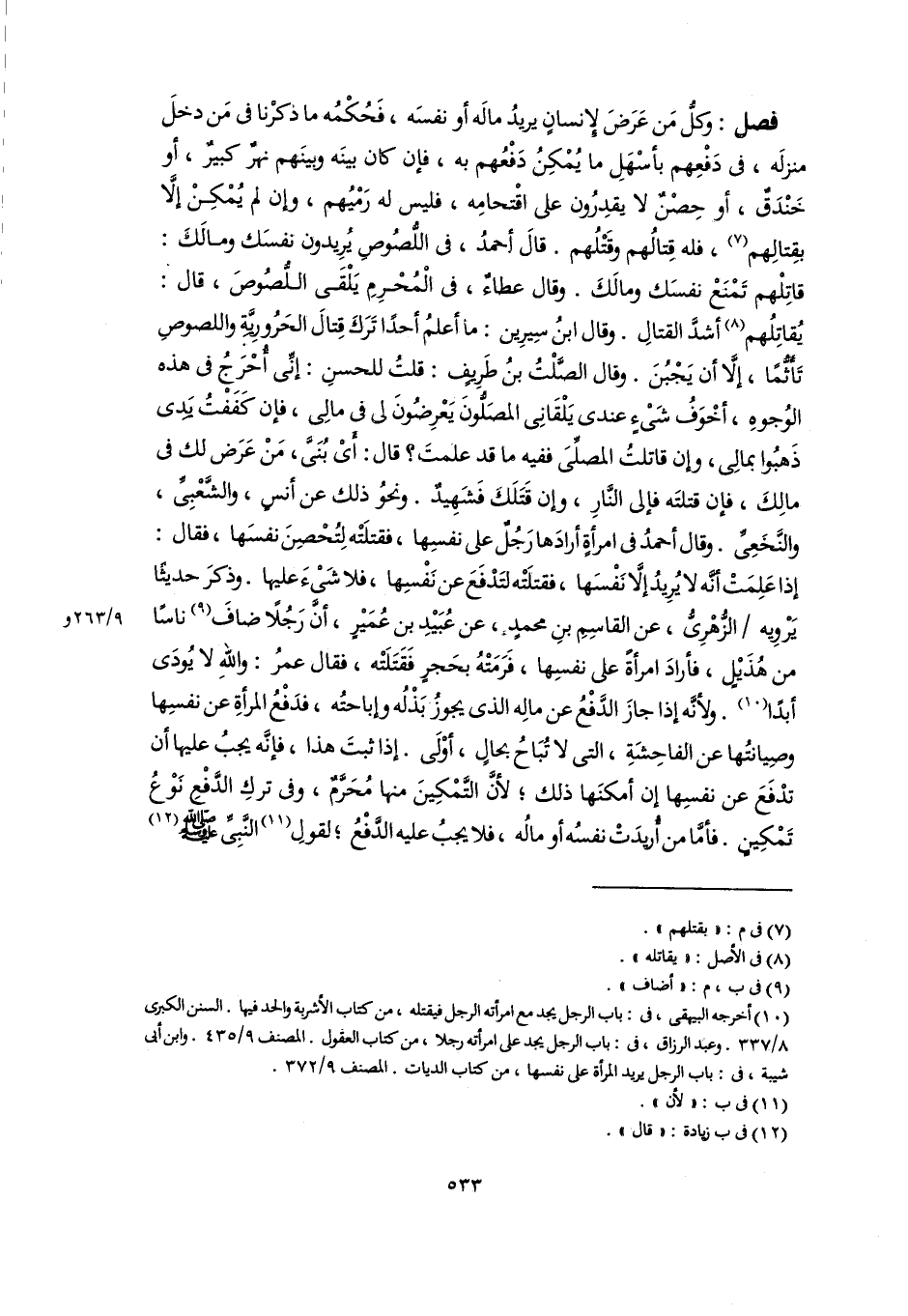فصل: وكلُّ مَن عَرَضَ لإِنسانٍ يريدُ مالَه أو نفسَه، فَحُكْمُه ما ذكرنا في مَن دخلَ منزلَه، في دَفْعِهم بأسْهَلِ ما يُمْكِنُ دَفْعُهم به، فإن كان بينَه وبينَهم نهرٌ كبيرٌ، أو خَنْدَقٌ، أو حِصْنٌ لا يقدِرُون على اقْتحامِه، فليس له رَمْيُهم، وإن لم يُمْكِنْ إلَّا بقِتالِهم (٧)، فله قِتالُهم وقَتْلُهم. قالَ أحمدُ، في اللُّصُوصِ يُرِيدون نفسَك ومالَكَ: قاتِلْهم تَمْنَعْ نفسَك ومالَكَ. وقال عطاءٌ، في الْمُحْرِمِ يَلْقَى اللُّصُوصَ، قال: يُقاتِلُهم (٨) أشدَّ القتالِ. وقال ابنُ سِيرِين: ما أعلمُ أحدًا تَرَكَ قِتالَ الحَرُورِيَّةِ واللصوصِ تَأَثُّمًا، إلَّا أن يَجْبُنَ. وقال الصَّلْتُ بنُ طَرِيفٍ: قلتُ للحسنِ: إنِّي أُحْرَجُ في هذه الوُجوهِ، أخْوَفُ شَىْءٍ عندى يَلْقَانِى المصَلُّونَ يَعْرِضُونَ لي في مالِى، فإن كَفَفْتُ يَدِى ذَهبُوا بمالِى، وإن قاتلتُ المصلِّىَ ففيه ما قد علمتَ؟ قال: أَىْ بُنَىَّ، مَنْ عَرَض لك في مالِكَ، فإن قتلتَه فإلى النَّارِ، وإن قَتَلَكَ فَشَهِيدٌ. ونحوُ ذلك عن أنسٍ، والشَّعْبِىِّ، والنَّخَعِىِّ. وقال أحمدُ في امرأةٍ أرادَها رَجُلٌ على نفسِها، فقتلَتْه لِتُحْصِنَ نفسَها، فقال: إذا عَلِمَتْ أنَّه لا يُرِيدُ إلَّا نَفْسَها، فقتلَتْه لتَدْفَعَ عن نَفْسِها، فلا شَىْءَ عليها. وذكرَ حديثًا يَرْوِيه الزُّهْرِىُّ، عن القاسِمِ بنِ محمدٍ، عن عُبَيْدِ بن عُمَيْرٍ، أنَّ رَجُلًا ضافَ (٩) ناسًا من هُذَيْلٍ، فأرادَ امرأةً على نفسِها، فَرَمَتْهُ بحَجرٍ فَقَتَلَتْه، فقال عمرُ: واللهِ لا يُودَى أبدًا (١٠). ولأنَّه إذا جازَ الدَّفْعُ عن مالِه الذي يجوزُ بَذْلُه وإباحتُه، فدَفْعُ المرأةِ عن نفسِها وصِيانتُها عن الفاحِشَةِ، التي لا تُبَاحُ بحالٍ، أوْلَى. إذا ثبتَ هذا، فإنَّه يجبُ عليها أن تدْفَعَ عن نفسِها إن أمكنَها ذلك؛ لأنَّ التَّمْكِينَ منها مُحَرَّمٌ، وفى تركِ الدَّفْعِ نَوْعُ تَمْكِينٍ. فأمَّا من أُريدَتْ نفسُه أو مالُه، فلا يجبُ عليه الدَّفْعُ؛ لقولِ (١١) النَّبِيِّ -صلى اللَّه عليه وسلم- (١٢)