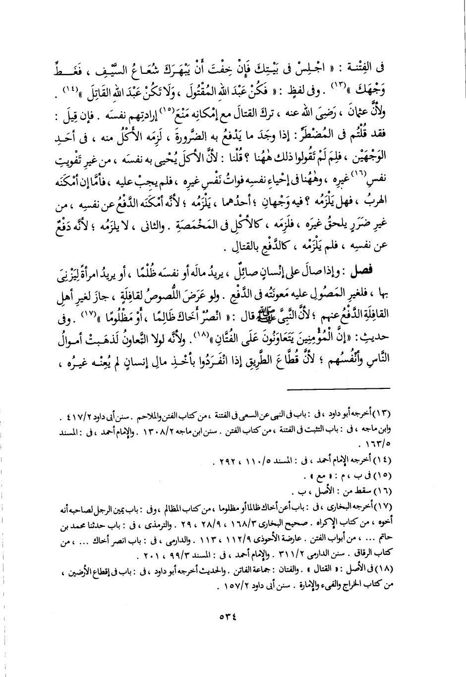 في الفِتْنة: "اجْلِسْ في بَيْتِكَ فَإِنْ خِفْتَ أَنْ يَبْهَرَكَ شُعَاعُ السَّيْفِ، فَغَطِّ وَجْهَكَ" (١٣). وفى لفظٍ: "فَكُنْ عَبْدَ اللهِ المُقْتُولَ، وَلَا تَكُنْ عَبْدَ اللَّه القَاتِلَ" (١٤). ولأنَّ عثمانَ، رَضِىَ اللَّه عنه، تركَ القتالَ مع إمْكانِه مَنْعَ (١٥) إرادتِهم نفسَه. فإن قِيلَ: فقد قُلْتُم في المُضْطَرِّ: إذا وجَدَ ما يَدْفعُ به الضَّرورةَ، لَزِمَه الأَكْلُ منه، في أحَدِ الوَجْهَيْن، فلِمَ لَمْ تَقُولوا ذلك ههُنا؟ قُلْنا: لأنَّ الأكلَ يُحْيى به نفسَه، من غيرِ تَفْويتِ نفسِ (١٦) غيرِه، وههُنا في إحْياءِ نفسِه فواتُ نَفْسِ غيرِه، فلم يجِبْ عليه، فأمَّا إن أمْكَنَه الهربُ، فهل يَلْزَمُه؟ فيه وَجْهانِ؛ أحدُهما، يَلْزَمُه؛ لأنَّه أمْكَنَه الدَّفْعُ عن نفسِه، من غيرِ ضَرَرٍ يلحقُ غيرَه، فلَزِمَه، كالأكْلِ في المَخْمَصَةِ. والثانى، لا يلزَمُه؛ لأنَّه دَفْعٌ عن نفسِه، فلم يَلْزَمْه، كالدَّفْعِ بالقتالِ.