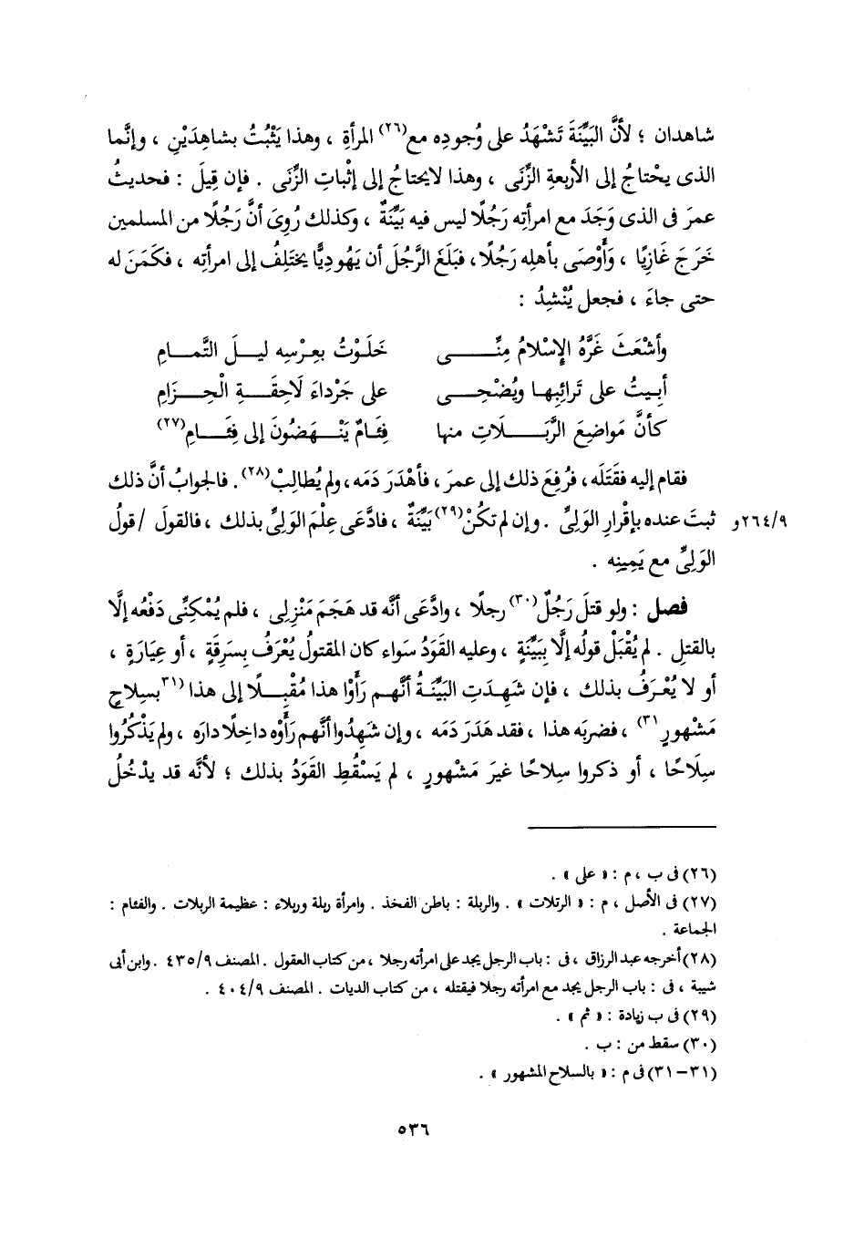 شاهدان؛ لأنَّ البَيِّنَةَ تَشْهَدُ على وُجودِه مع (٢٦) المرأةِ، وهذا يَثْبُتُ بشاهِدَيْنِ، وإنَّما الذي يحْتاجُ إلى الأربعةِ الزِّنَى، وهذا لا يحتاجُ إلى إثْباتِ الزِّنَى. فإن قِيلَ: فحديثُ عمرَ في الذي وَجَدَ مع امرأتِه رَجُلًا ليس فيه بَيِّنَةٌ، وكذلك رُوِىَ أنَّ رَجُلًا من المسلمين خَرَجَ غَازِيًا، وَأَوْصَى بأهلِه رَجُلًا، فبَلَغ الرَّجُلَ أن يَهُودِيًّا يختَلِفُ إلى امرأتِه، فكَمَنَ له حتى جاءَ، فجعل يُنْشِدُ: