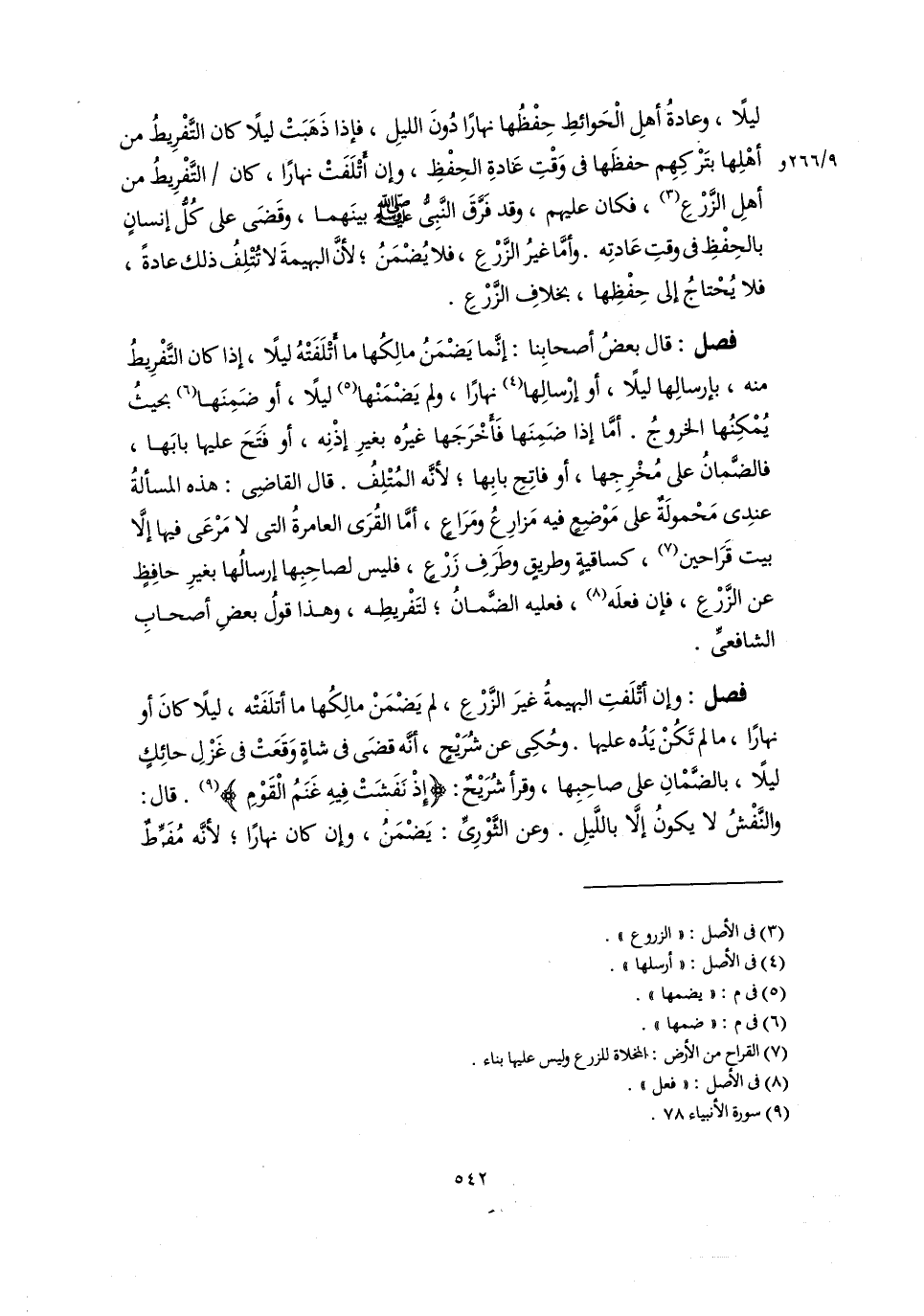 ليلًا، وعادةُ أهلِ الْحَوائطِ حِفْظُها نهارًا دُونَ الليلِ، فإذا ذَهَبَتْ ليلًا كان التَّفْرِيطُ من أهْلِها بتَرْكِهِم حفظَها في وَقْتِ عَادةِ الحِفْظِ، وإن أَتْلَفَتْ نهارًا، كان التَّفْرِيطُ من أهلِ الزَّرْعِ (٣)، فكان عليهم، وقد فَرَّقَ النَّبِىُّ -صلى اللَّه عليه وسلم- بينَهما، وقَضَى على كُلُّ إنسانٍ بالحِفْظِ في وقتِ عَادتِه. وأمَّا غيرُ الزَّرْعِ، فلا يُضْمَنُ؛ لأنَّ البهيمةَ لا تُتْلِفُ ذلك عادةً، فلا يُحْتاجُ إلى حِفْظِها، بخلافِ الزَّرْعِ.