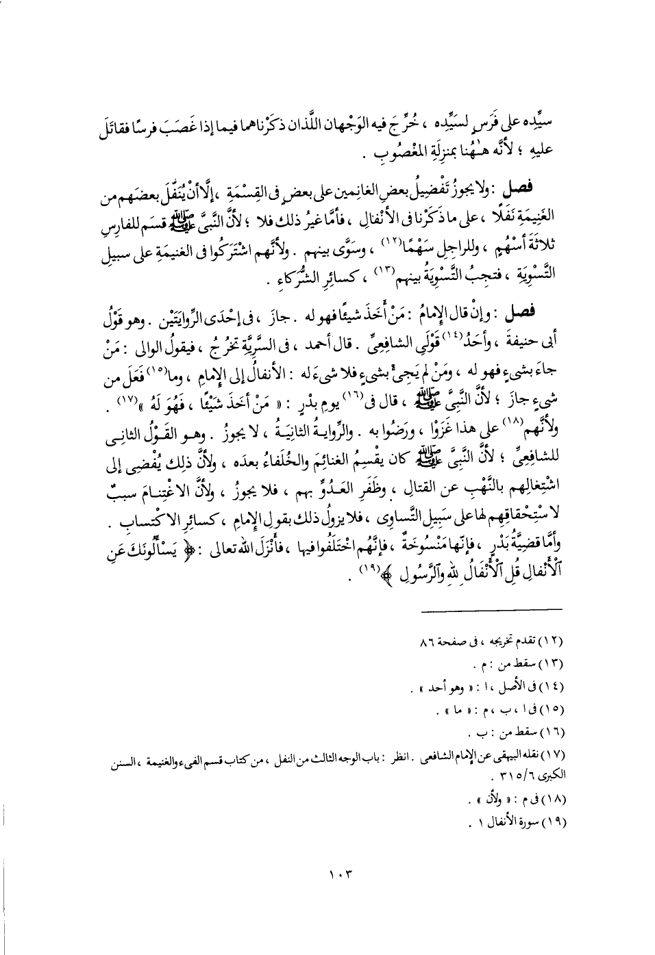 (١٧) نقله البيهقى عن الإِمام الشافعى. انظر: باب الوجه الثالث من النفل، من كتاب قسم الفىء والغنيمة، السنن الكبرى ٦/ ٣١٥.