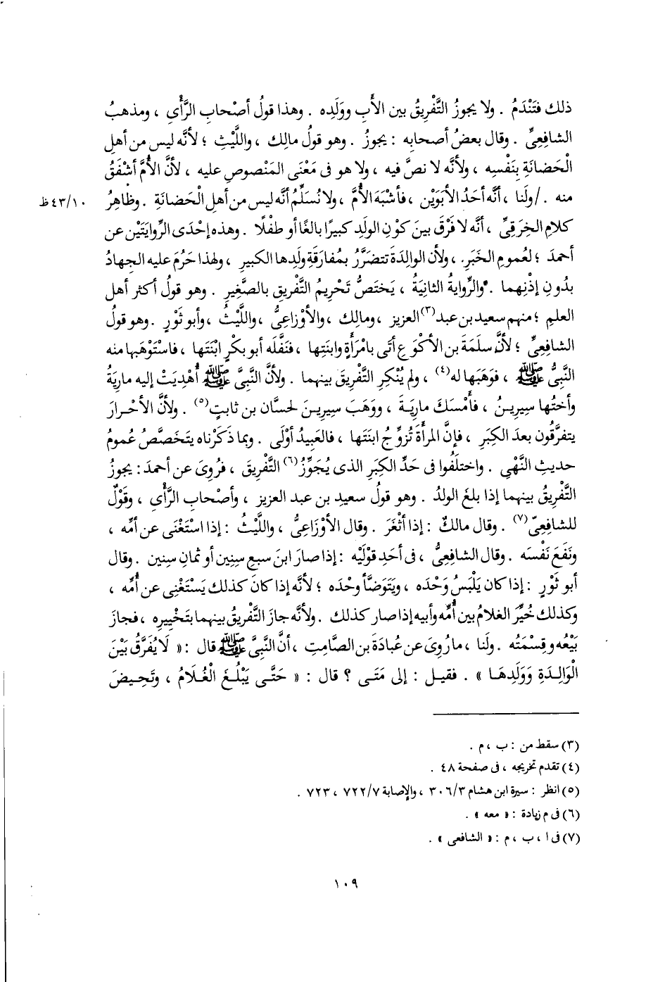 ذلك فتَنْدَمُ. ولا يجوزُ التَّفْرِيقُ بين الأبِ ووَلَدِه. وهذا قولُ أصْحابِ الرَّأْىِ، ومذهبُ الشافِعِىِّ. وقال بعضُ أصحابِه: يجوزُ. وهو قولُ مالِك، واللَّيْثِ؛ لأنَّه ليس من أهلِ الْحَضانَةِ بِنَفْسِه، ولأنَّه لا نصَّ فيه، ولا هو فى مَعْنَى المَنْصوصِ عليه، لأنَّ الأُمَّ أشْفَقُ منه. ولَنا، أنَّه أحَدُ الأبَوَيْن، فأشْبَهَ الأُمَّ، ولا نُسَلِّمُ أنّه ليس من أهلِ الْحَضانَةِ. وظاهِرُ كلامِ الخِرَقِىِّ، أنَّه لا فَرْقَ بينَ كوْنِ الوَلَدِ كبيرًا بالغًا أو طفْلًا. وهذه إحْدَى الرِّوايَتَيْن عن أحمدَ؛ لعُمومِ الخَبَرِ، ولأن الوالِدَةَ تتضَرَّرُ بمُفارَقَةِ ولَدِها الكبيرِ، ولهذا حَرُمَ عليه الجهادُ بدُونِ إذْنِهما. والرِّوايةُ الثانِيَةُ، يَختَصُّ تَحْرِيمُ التَّفْريقِ بالصَّغِيرِ. وهو قولُ أكثر أهل العلمِ؛ منهم سعيد بن عبد (٣) العزيز، ومالِك، والأوْزاعِىُّ، واللَّيْثُ، وأبو ثَوْرٍ. وهو قولُ الشافِعِىِّ؛ لأنَّ سلَمَةَ بن الأكْوَعِ أتَى بامْرأَةٍ وابنَتِها، فنَفَّلَه أبو بكْرٍ ابْنَتَها، فاسْتَوْهَبها منه النَّبِىُّ -صَلَّى اللهُ عَلَيْهِ وَسَلَّمَ-، فوَهَبَها له (٤)، ولم يُنْكِرِ التَّفْرِيقَ بينهما. ولأنَّ النَّبِىَّ -صَلَّى اللهُ عَلَيْهِ وَسَلَّمَ- أُهْدِيَتْ إليه مارِيَةُ وأختُها سِيرِينُ، فأَمْسَكَ مارِيَةَ، ووَهَبَ سِيرِينَ لحسَّان بن ثابتٍ (٥). ولأنَّ الأحْرارَ يتفرَّقُون بعدَ الكِبَرِ، فإنَّ المرأَةَ تُزوِّجُ ابنَتَها، فالعَبيدُ أوْلَى. وبما ذَكَرْناه يتَخَصَّصُ عُمومُ حديثِ النَّهْىِ. واختلَفُوا فى حَدِّ الكِبَرِ الذى يُجَوِّزُ (٦) التَّفْرِيقَ، فرُوِىَ عن أحمدَ: يجوزُ التَّفْرِيقُ بينهما إذا بلغ الولدُ. وهو قولُ سعيدِ بن عبد العزيز، وأصْحابِ الرَّأْىِ، وقَوْلٌ للشافِعِىّ (٧). وقال مالكٌ: إذا أثْغَرَ. وقال الأوْزَاعِىُّ، واللَّيْثُ: إذا اسْتَغْنَى عن أمِّه، ونَفَعَ نَفْسَه. وقال الشافِعِىُّ، فى أحَدِ قوْلَيْه: إذا صارَ ابنَ سبعِ سِنِين أو ثمانِ سِنين. وقال أبو ثَوْرٍ إذا كان يَلْبَسُ وَحْدَه، ويَتَوَضَّأ وحْدَه؛ لأنَّه إذا كان كذلك يَسْتَغْنِى عن أُمِّه، وكذلك خُيِّرَ الغلامُ بين أُمِّه وأبيه إذا صار كذلك. ولأنَّه جازَ التَّفْريقُ بينهما بتَخْيِيرِه، فجازَ بَيْعُه وقِسْمَتُه. ولَنا، ما رُوِىَ عن عُبادَةَ بن الصَّامِتِ، أنَّ النَّبِىَّ -صَلَّى اللهُ عَلَيْهِ وَسَلَّمَ- قال: "لَا يُفَرَّقُ بَيْنَ الْوَالِدَةِ وَوَلَدِهَا". فقيل: إلى مَتَى؟ قال: "حَتَّى يَبْلُغَ الْغُلَامُ، وتَحِيضَ