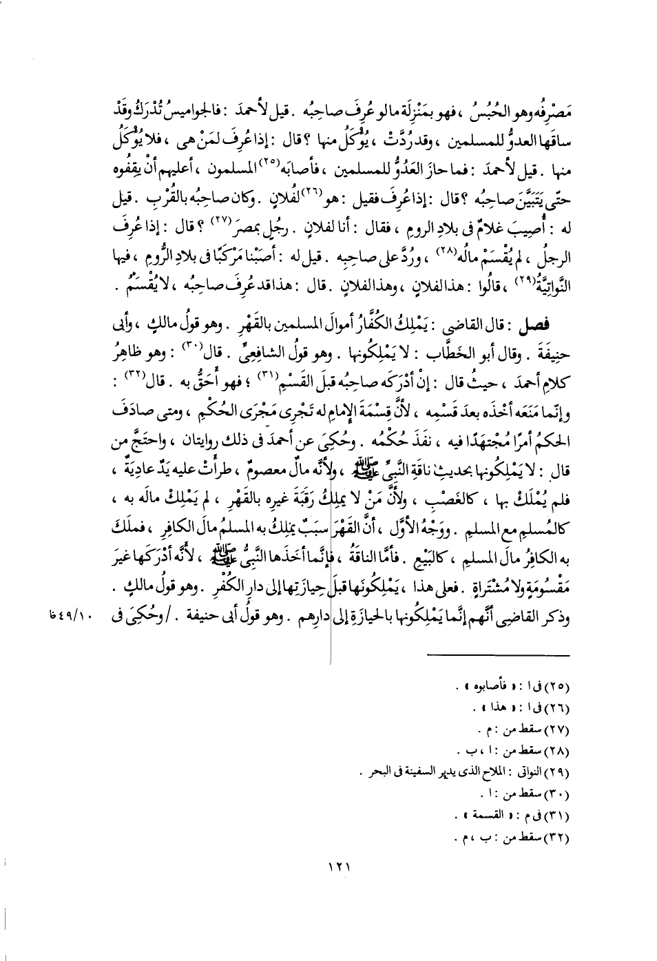 مَصْرِفُه وهو الحُبُسُ، فهو بمَنْزِلَة ما لو عُرِفَ صاحِبُه. قيل لأحمدَ: فالجواميسُ تُدْرَكُ وقَدْ ساقَها العدوُّ للمسلمين، وقد رُدَّتْ، يُؤْكَلُ منها؟ قال: إذا عُرِفَ لمَنْ هى، فلا يُؤْكَلُ منها. قيل لأحمدَ: فما حازَ العَدُوُّ للمسلمين، فأصابَه (٢٥) المسلمون، أعليهم أنْ يقِفُوه حتّى يَتَبَيَّنَ صاحِبُه؟ قال: إذا عُرِفَ فقيل: هو (٢٦) لفُلانٍ. وكان صاحِبُه بالقُرْبِ. قيل له: أُصِيبَ غلامٌ فى بلادِ الرومِ، فقال: أنا لفلانٍ. رجُلٍ بمصرَ (٢٧)؟ قال: إذا عُرِفَ الرجلُ، لم يُقْسَمْ مالُه (٢٨)، ورُدَّ على صاحِبِه. قيل له: أصَبْنا مَرْكَبًا فى بلادِ الرُّومِ، فيها النَّواتِيَّةُ (٢٩)، قالُوا: هذا لفلانٍ، وهذا لفلانٍ. قال: هذا قد عُرِفَ صاحِبُه، لا يُقْسَمُ.