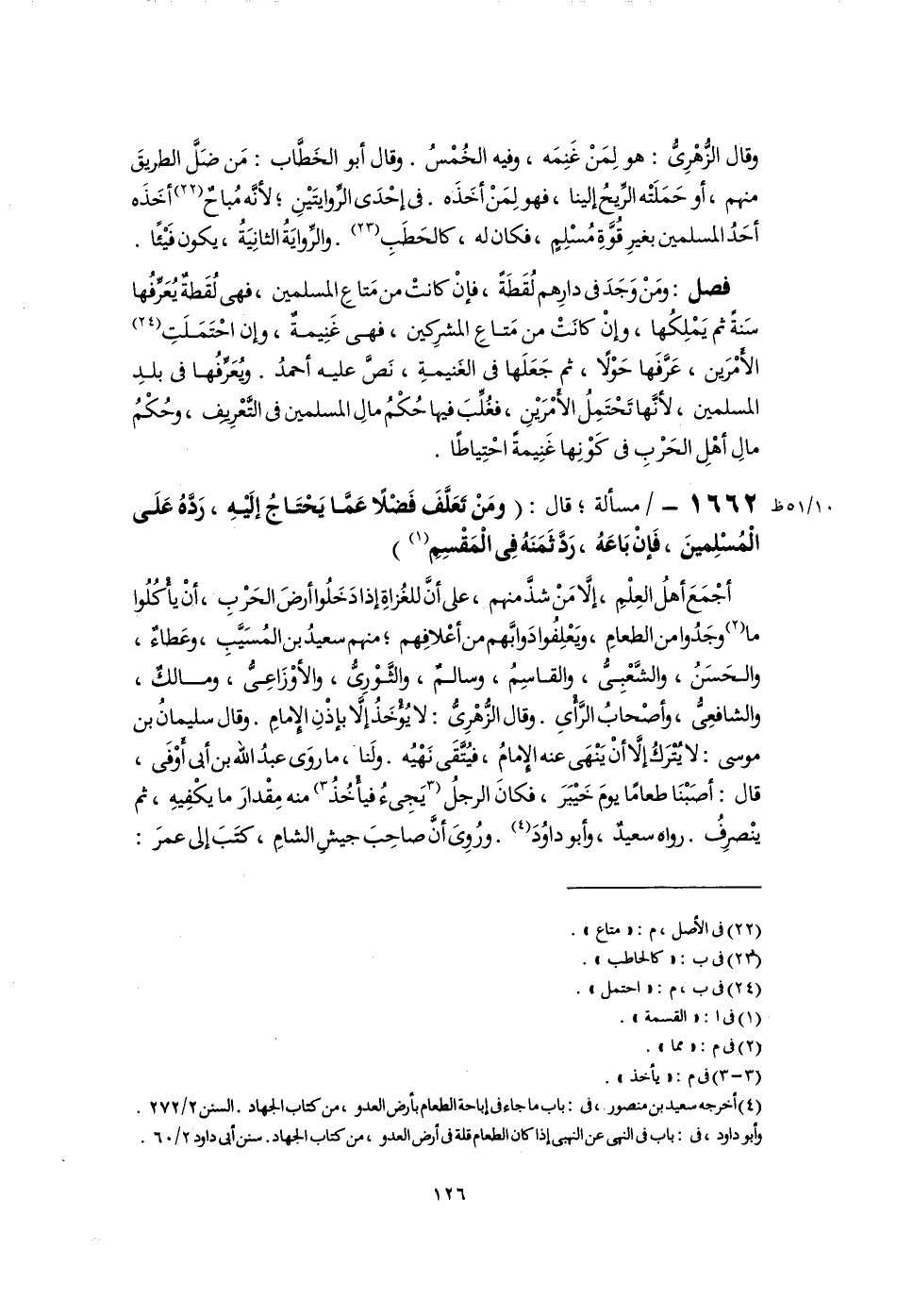 (٤) أخرجه سعيد بن منصور، فى: باب ما جاء في إباحة الطعام بأرض العدو، من كتاب الجهاد. السنن ٢/ ٢٧٢. وأبو داود، فى: باب فى النهى عن النهى إذا كان الطعام قلة فى أرض العدو، من كتاب الجهاد. سنن أبى داود ٢/ ٦٠.