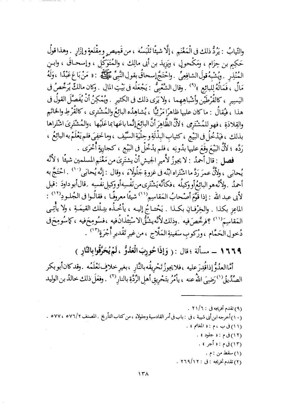 والثِّيابُ: يَرُدُّ ذلك فى الْمَغْنَمِ، إلَّا شيئًا تَلْبَسُه، من قَمِيصٍ ومِقْنَعةٍ وإزَارٍ. وهذا قولُ حَكِيم بن حِزَام، ومَكْحولٍ، وَيزِيدَ بن أبي مالِك، والمُتَوَكِّلِ، وإسحاقَ، وابنِ المُنْذِرِ. ويُشْبِهُ قولَ الشافِعِىِّ. واحْتَجَّ إسحاقُ بقولِ النَّبِيِّ -صَلَّى اللهُ عَلَيْهِ وَسَلَّمَ-: "مَنْ بَاعَ عَبْدًا، وَلَهُ مَالٌ، فَمَالُهُ لِلبائِعِ" (٩). وقال الشَّعْبِىُّ: يَجْعَلُه فى بَيْتِ المالِ. وكان مالكٌ يُرَخِّصُ فى اليَسِيرِ، كالقُرْطَيْن وأشْباهِهِما، ولا يَرَى ذلك فى الكثيرِ. ويُمْكِنُ أنْ يُفَصَّلَ القولُ فى هذا، فيُقالُ: ما كان عليهَا ظاهرًا مَرْئِيًّا، يُشاهِدُه البائِعُ والمُشْترِى، كالقُرْطِ والخاتَمِ والقِلادَةِ، فهو للمُشْتَرِى، لأنَّ الظَّاهِرَ أنَّ البائِعَ إنَّما باعَها مما عَلَيْها، والمُشْتَرِىَ اشْتَراها بذلك، فيَدْخُلُ فى البَيْعِ، كثيابِ البِذْلَةِ وحِلْيَةِ السَّيْفِ، وما خَفِىَ فلم يَعْلَمْ به البائِعُ، رَدَّه؛ لأنَّ البَيْعَ وقَعَ عليها بدُونِه، فلم يدْخُلْ فى البَيْعِ، كجارِيةٍ أُخْرَى.
