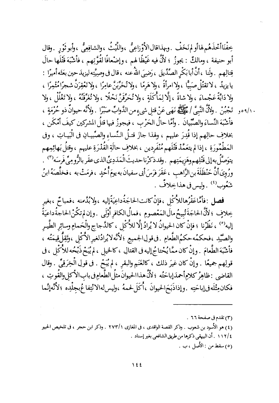 خِفْنَا أخْذَهُم لها أو لم نَخَفْ. وبهذا قال الأوْزاعِىُّ، واللَّيْثُ، والشافِعِىُّ، وأبو ثَوْرٍ. وقال أبو حَنِيفة، ومالكٌ: يجوزُ، لأنَّ فيه غَيْظًا لهم، وإضْعافًا لقُوَّتِهم، فأشْبَهَ قَتْلَها حالَ قِتالِهم. ولَنا، أنَّ أبا بَكْرٍ الصِّدِّيقَ، رَضِىَ اللهُ عنه، قال فى وصِيَّتِه ليزيدَ حين بعَثَه أميرًا: يا يزيدُ، لاتقتُلْ صَبِيًّا، ولا امرأةً، ولا هَرِمًا، ولا تُخَرِّبَنَّ عامِرًا، ولا تَعْقِرَنَّ شجرًا مُثْمِرًا، ولا دَابَّةً عَجْماءَ، ولا شاةً، إلَّا لِمَأْكَلَةٍ، ولا تُحَرِّقَنَّ نَحْلًا، ولا تُغَرِّقَنَّهُ، ولا تَغْلُلْ، ولا تَجْبُنْ. ولأنَّ النَّبِىَّ -صَلَّى اللهُ عَلَيْهِ وَسَلَّمَ- نَهَى عَنْ قتلِ شيْءٍ من الدَّوابِّ صَبْرًا. ولأنَّه حيوانٌ ذو حُرْمَةٍ، فأشْبَهَ النِّساءَ والصِّبْيَانَ. وأمَّا حالُ الحَرْبِ، فيجوزُ فيها قتلُ المشركين كيفَ أَمْكَن، بخلافِ حالِهم إذا قُدِرَ عليهم، ولهذا جازَ قتلُ النِّساءِ والصِّبْيانِ فى الْبَياتِ، وفى المَطْمُورَةِ، إذا لم يتعَمَّدْ قَتْلَهم مُنْفرِدين، بخلافِ حالَةِ القُدْرَةِ عليهم، وقتلُ بَهائِمِهم يتوَصَّلُ به إلى قَتْلِهم وهَزِيمَتِهم. وقد ذكرْنا حديثَ الْمَدَدِىِّ الذى عقَر بالرُّومِىِّ فَرسَه (٣). ورُوِىَ أنَّ حَنْظَلَةَ بن الرَّاهبِ، عَقَرَ فرَسَ أبى سفيانَ به يومَ أُحُدٍ، فرمَتْ به، فخلَّصَهُ ابنُ شَعُوب (٤). وليس فى هذا خِلافٌ.