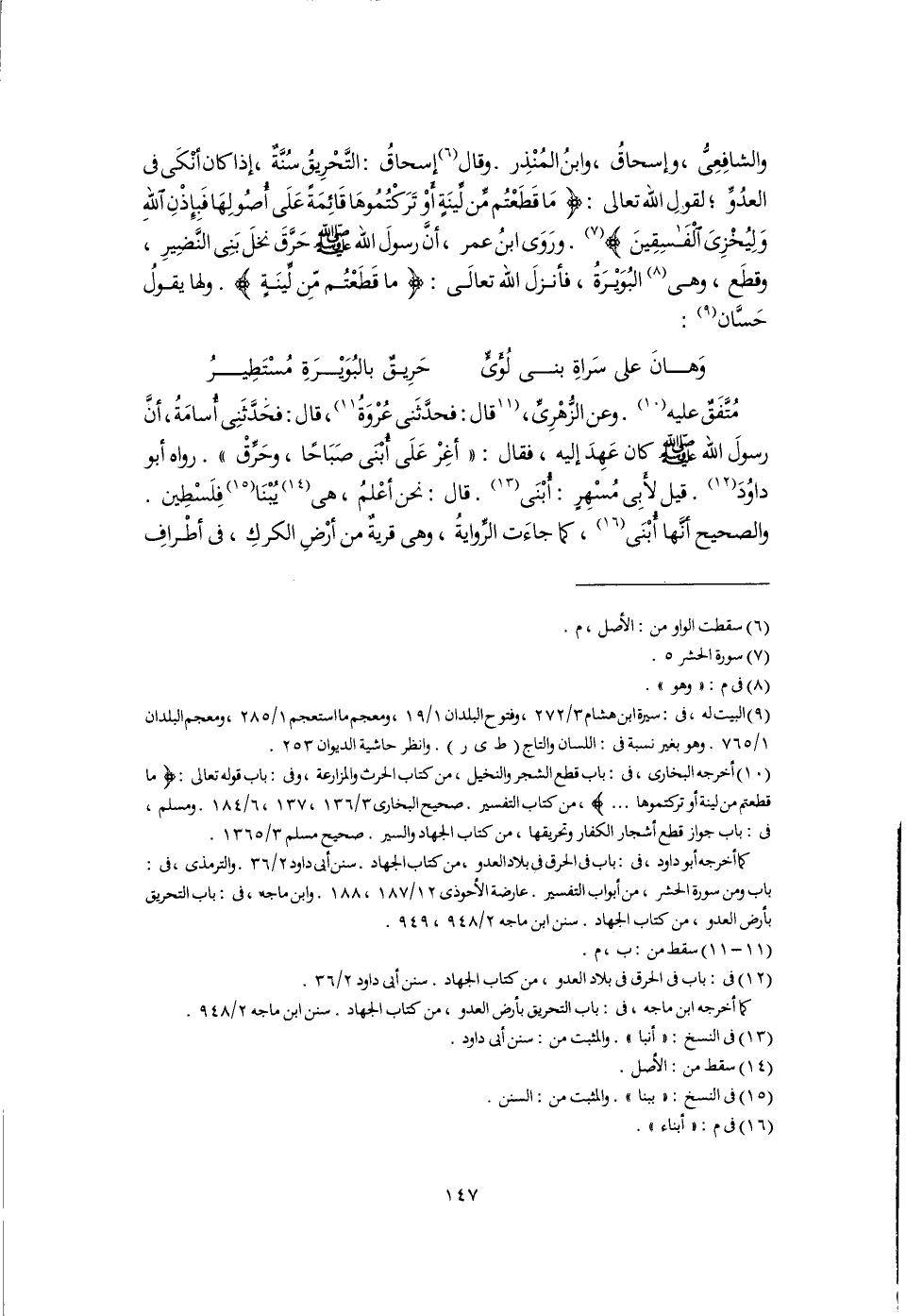 كما أخرجه أبو داود، فى: باب فى الحرق فى بلاد العدو، من كتاب الجهاد. سنن أبي داود ٢/ ٣٦. والترمذى، فى: باب ومن سورة الحشر، من أبواب التفسير. عارضة الأحوذى ١٢/ ١٨٧، ١٨٨. وابن ماجه، فى: باب التحريق بأرض العدو، من كتاب الجهاد. سنن ابن ماجه ٢/ ٩٤٨، ٩٤٩.