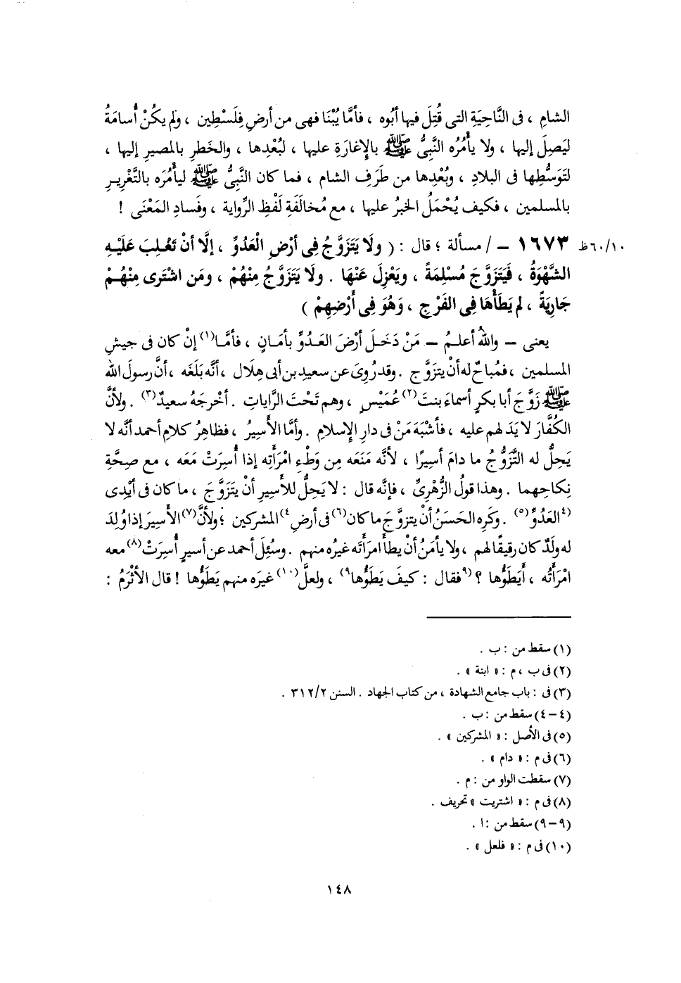 يعنى -واللهُ أعلمُ- مَنْ دَخَلَ أرْضَ العَدُوِّ بأمَانٍ، فأَمَّا (١) إنْ كان فى جيشِ المسلمين، فمُباحٌ له أنْ يتزَوَّج. وقد رُوِىَ عن سعيدِ بن أبي هِلَال، أَنَّه بَلَغَه، أنَّ رسولَ اللَّه -صَلَّى اللهُ عَلَيْهِ وَسَلَّمَ- زَوَّجَ أبا بكرٍ أَسماءَ بنتَ (٢) عُمَيْسٍ، وهم تَحْتَ الرَّاياتِ. أخْرجَهُ سعيدٌ (٣). ولأنَّ الكُفَّارَ لا يَدَ لهم عليه، فأشْبَهَ مَنْ فى دارِ الإِسلامِ. وأمَّا الأسِيرُ، فظاهِرُ كلامِ أحمد أنَّه لا يَحِلُّ له التَّزَوُّجُ ما دامَ أسِيرًا، لأنَّه مَنَعَه مِن وَطْءِ امْرَأَتِه إذا أُسِرَتْ مَعَه، مع صِحَّةِ نِكاحِهما. وهذا قولُ الزُّهْرِىِّ، فإنَّه قال: لا يَحِلُّ للأَسِيرِ أنْ يتَزَوَّجَ، ما كان فى أَيْدِى [العَدُوِّ (٤). وكَرِه الحَسَنُ أنْ يتزوَّجَ ما كان (٥) فى أرضِ] (٦) المشركين، ولأنَّ (٧) الأسِيرَ إذا وُلِدَ له ولَدٌ كان رقيقًا لهم، ولا يأمَنُ أنْ يطأَ امرَأَتَه غيرُه منهم. وسُئِلَ أحمد عن أسيرٍ أُسِرَتْ (٨) معه امْرَأَتُه، أَيَطؤُها؟ [فقال: كيفَ يَطَؤُها] (٩)، ولعلَّ (١٠) غيرَه منهم يَطَؤُها! قال الأَثْرَمُ: