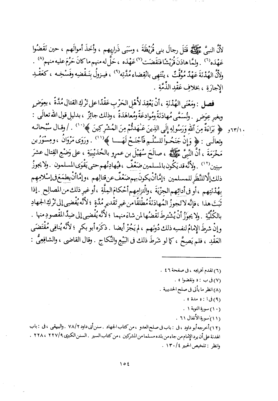 فصل: ومَعْنَى الهُدْنَةِ، أنْ يَعْقِدَ لأهْلِ الحَرْبِ عَقْدًا على تَرْكِ القتالِ مُدَّةً، بعِوَضٍ وبغيرِ عِوَضٍ. وَتُسَمَّى مُهادَنَةً ومُوادعَةً ومُعاهَدَةً، وذلك جائِزٌ، بدليلِ قول اللَّه تعالَى: {بَرَاءَةٌ مِنَ اللَّهِ وَرَسُولِهِ إِلَى الَّذِينَ عَاهَدْتُمْ مِنَ الْمُشْرِكِينَ} (١٠). وقال سُبْحانَه وتعالَى: {وَإِنْ جَنَحُوا لِلسَّلْمِ فَاجْنَحْ لَهَا} (١١). ورَوَى مَرْوَانُ، ومِسْوَرُ بن مَخْرَمَةَ، أنَّ النَّبِىَّ -صَلَّى اللهُ عَلَيْهِ وَسَلَّمَ-، صالَحَ سُهَيْلَ بن عمرٍو بالحُدَيْبِيَةِ، على وَضْعِ القِتالِ عشرَ سِنِين (١٢). ولأنَّه قد يَكُون بالمسلمين ضَعْفٌ، فيُهادِنُهم حتَّى يَقْوَى المسلمون. ولا يجوزُ ذلك إلَّا للنَّظَرِ للمسلمين؛ إمَّا أنْ يكونَ بهم ضَعْفٌ عن قتالِهم، وإمَّا أنْ يطمَعَ فى إسْلامِهِم بِهُدْنَتِهم، أو فى أدائِهم الجِزْيَةَ، والْتزامِهم أحْكامَ المِلَّةِ، أو غيرِ ذلك من المصالِح. إذا ثَبَتَ هذا، فإنَّه لا تَجوزُ المُهادَنَةُ مُطْلقًا من غيرِ تَقْديرِ مُدَّةٍ؛ لأنَّه يُفْضِى إلى تَرْكِ الجهادِ بالكُلِّيَّةِ. ولا يجوزُ أنْ يُشْترطَ نَقْضُها لمن شاءَ منهما؛ لأنَّه يُفْضِى إلى ضِدِّ المقْصودِ منها. وإنْ شرطَ الإِمامُ لنفسِه ذلك دُونَهم، لم يَجُزْ أيضًا. ذكَرَه أبو بكرٍ؛ لأنَّه يُنافِى مُقْتَضَى العَقْدِ، فلم يَصِحَّ، كما لو شَرطَ ذلك فى البَيْعِ والنِّكاحِ. وقال القاضى، والشافِعِىُّ: