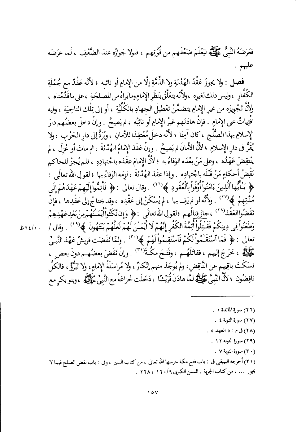 فصل: ولا يجوزُ عَقْدُ الهُدْنَةِ ولا الذِّمَّةِ إِلَّا من الإِمامِ أو نائبِه؛ لأنَّه عَقْدٌ مع جُمْلَةِ الكُفَّارِ، وليس ذلك لغيرِه، ولأنّه يتعَلَّقُ بنَظَرِ الإِمامِ وما يَرَاهُ من المصلحَةِ، على ما قَدَّمْناه، ولأنَّ تَجْوِيزَه من غيرِ الإِمامِ يتضمَّنُ تعْطيلَ الجِهادِ بالكُلِّيَّةِ، أو إلى تِلْك الناحِيَةِ، وفيه افْتِياتٌ على الإِمامِ. فإنْ هادَنَهم غيرُ الإِمامِ أو نائِبُه، لم يَصِحَّ. وإنْ دخلَ بعضُهم دارَ الإِسلامِ بهذا الصُّلْحِ، كان آمِنًا؛ لأنَّه دخلَ مُعْتقِدًا للأمانِ، ويُرَدُّ إلى دارِ الحَرْبِ، ولا يُقَرُّ فى دارِ الإسلامِ، لأنَّ الأمانَ لم يَصِحَّ. وإنْ عَقَدَ الإِمامُ الهُدْنَةَ، ثمَّ ماتَ أو عُزِلَ، لم ينْتقِضْ عَهْدُه، وعلى مَنْ بعْدَه الوَفاءُ به، لأنَّ الإِمامَ عقَدَه باجْتهادِهِ، فلم يُجزْ للحاكمِ نَقضُ أحكامِ مَنْ قَبْلَه باجْتهادِه. وإذا عقَدَ الهُدْنَةَ، لزِمَه الوَفاءُ بها؛ لقولِ اللَّه تعالَى: {يَاأَيُّهَا الَّذِينَ آمَنُوا أَوْفُوا بِالْعُقُودِ} (٢٦). وقال تعالى: {فَأَتِمُّوا إِلَيْهِمْ عَهْدَهُمْ إِلَى مُدَّتِهِمْ} (٢٧). ولأنَّه لو لم يَفِ بها، لم يُسْكَنْ إلى عَقْدِه، وقد يحتاجُ إلى عَقْدِها، فإنْ نَقَضُوا العَقْدَ (٢٨)، جازَ قِتالُهم؛ لقولِ اللَّه تعالَى: {وَإِنْ نَكَثُوا أَيْمَانَهُمْ مِنْ بَعْدِ عَهْدِهِمْ وَطَعَنُوا فِي دِينِكُمْ فَقَاتِلُوا أَئِمَّةَ الْكُفْرِ إِنَّهُمْ لَا أَيْمَانَ لَهُمْ لَعَلَّهُمْ يَنْتَهُونَ} (٢٩). وقال تعالى: {فَمَا اسْتَقَامُوا لَكُمْ فَاسْتَقِيمُوا لَهُمْ} (٣٠). ولمَّا نَقَضَت قريشٌ عَهْدَ النَّبىِّ -صَلَّى اللهُ عَلَيْهِ وَسَلَّمَ-، خَرَجَ إليهم، فقاتَلَهُم، وفَتَحَ مكَّةَ (٣١). وإنْ نَقَضَ بعضُهم دونَ بعضٍ، فسَكَتَ باقِيهم عن النَّاقِضِ، ولم يُوجَدْ منهم إنْكارٌ، ولا مُراسَلَةُ الإِمامِ، ولا تَبَرُّؤٌ، فالكلُّ ناقِضُون، لأنَّ النَّبِىَّ -صَلَّى اللهُ عَلَيْهِ وَسَلَّمَ- لمَّا هادَنَ قُرَيْشًا، دَخَلَت خُزاعَةُ مع النَّبِىِّ -صَلَّى اللهُ عَلَيْهِ وَسَلَّمَ-، وبنو بكرٍ مع