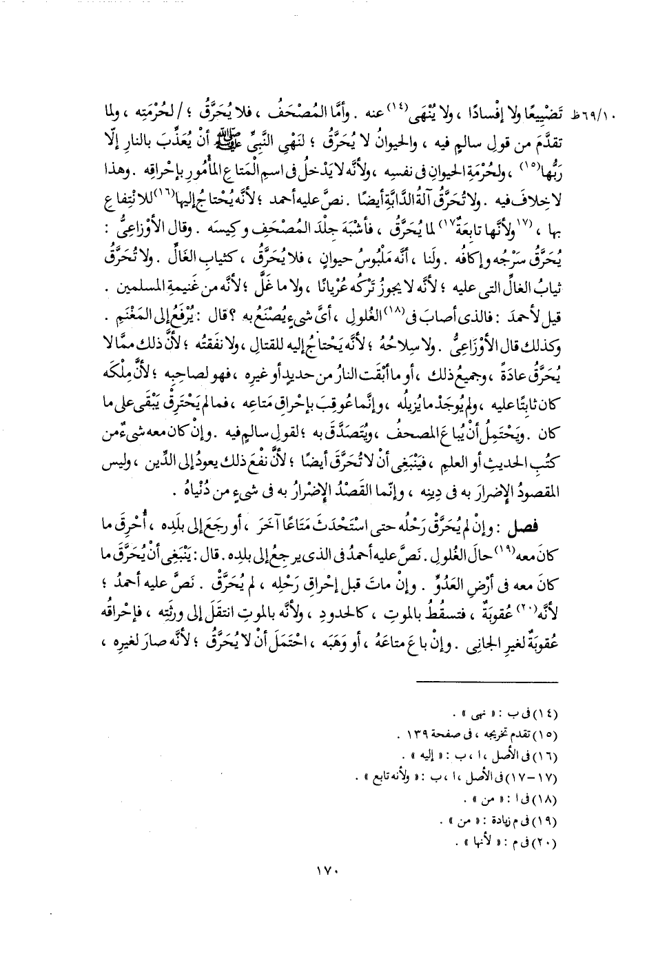 تَضْيِيعًا ولا إفْسادًا، ولا يُنْهَى (١٤) عنه. وأمَّا المُصْحَفُ، فلا يُحَرَّقُ؛ لحُرْمَتِه، ولما تقدَّمَ من قولِ سالمٍ فيه، والحيوانُ لا يُحَرَّقُ، لنَهْىِ النَّبِىِّ -صلى اللَّه عليه وسلم- أَنْ يُعَذِّبَ بالنارِ إلّا رَبُّها (١٥)، ولحُرْمَةِ الحيوانِ فى نفسِه، ولأنَّه لا يَدْخلُ فى اسمِ الْمَتاعِ المأْمُورِ بإحْراقِه. وهذا لا خِلافَ فيه. ولا تُحَرَّقُ آلةُ الدَّابَّةِ أيضًا. نصَّ عليه أحمد؛ لأنَّه يُحْتاجُ إليها (١٦) للانْتِفاعِ بها، [ولأنَّها تابِعَةٌ] (١٧) لما يُحَرَّقُ، فأشْبَهَ جِلْدَ المُصْحَفِ وكِيسَه. وقال الأوْزاعِىُّ: يُحَرَّقُ سَرْجُه وإكافُه. ولَنا، أنَّه مَلْبُوسُ حيوانٍ، فلا يُحَرَّقُ، كثيابِ الغَالِّ. ولا تُحَرَّقُ ثيابُ الغالِّ التى عليه؛ لأنَّه لا يجوزُ تَرْكُه عُرْيانًا، ولا ما غَلَّ؛ لأنَّه من غَنيمةِ المسلمين. قيل لأحمدَ: فالذى أصابَ فى (١٨) الغُلولِ، أىَّ شىْءٍ يُصْنَعُ به؟ قال: يُرْفَعُ إلى المَغْنَمِ. وكذلك قال الأوْزَاعِىُّ. ولا سِلاحُهُ؛ لأنَّه يَحْتاجُ إليه للقتالِ، ولا نفَقتُه؛ لأنَّ ذلك ممَّا لا يُحَرَّقُ عادَةً، وجميعُ ذلك، أو ما أبْقَت النارُ من حديدٍ أو غيرِه، فهو لصاحِبِه؛ لأنَّ مِلْكَه كان ثابِتًا عليه، ولم يُوجَدْ ما يُزيلُه، وإنَّما عُوقِبَ بإحْراقِ مَتاعِه، فما لم يَحْتَرِقْ يَبْقَى على ما كان. ويَحْتَمِلُ أَنْ يُباعَ المصحفُ، ويُتَصَدَّقَ به، لقولِ سالمٍ فيه. وإِنْ كان معه شىءٌ من كتُبِ الحديثِ أو العلمِ، فيَنْبَغِى أَنْ لا تُحَرَّقَ أيضًا؛ لأنَّ نفْعَ ذلك يعودُ إلى الدِّين، وليس المقصودُ الإِضرارَ به فى دِينِه، وإنّما القَصْدُ الإضْرارُ به فى شىءٍ من دُنْياهُ.