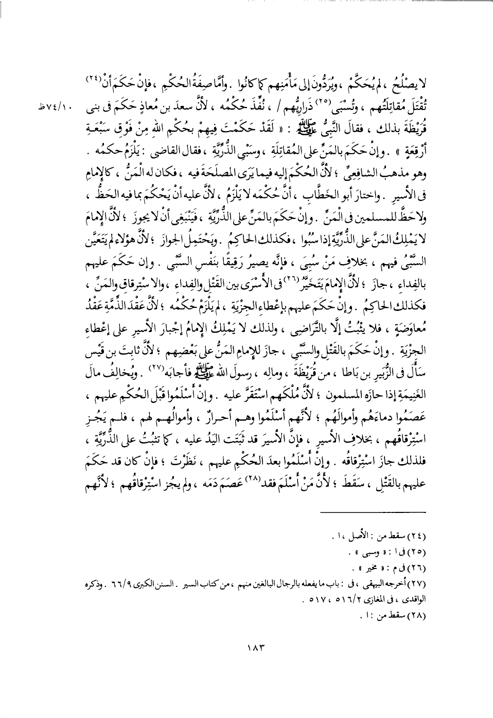 (٢٧) أخرجه البيهقى، فى: باب ما يفعله بالرجال البالغين منهم، من كتاب السير. السنن الكبرى ٩/ ٦٦. وذكره الواقدى، فى المغازى ٢/ ٥١٦، ٥١٧.