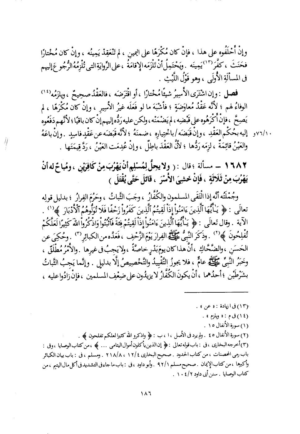 وجُمْلَتُه أنَّه إذا الْتَقَى المسلمون والكُفَّارُ، وجَبَ الثَّباتُ، وحَرُمَ الفِرارُ؛ بدليل قولِه تعالَى: {يَاأَيُّهَا الَّذِينَ آمَنُوا إِذَا لَقِيتُمُ الَّذِينَ كَفَرُوا زَحْفًا فَلَا تُوَلُّوهُمُ الْأَدْبَارَ} (١). الآية. وقال تَعالَى: {يَاأَيُّهَا الَّذِينَ آمَنُوا إِذَا لَقِيتُمْ فِئَةً فَاثْبُتُوا وَاذْكُرُوا اللَّهَ كَثِيرًا لَعَلَّكُمْ تُفْلِحُونَ} (٢). وذَكَرَ النَّبىُّ -صلى اللَّه عليه وسلم- الفِرارَ يَوْمَ الزَّحْفِ، فَعَدَّه من الكبائِرِ (٣). وحُكِىَ عن الحَسَنِ، والضَّحَّاكِ، أَنَّ هذا كان يومَ بَدْرٍ خاصَّةً، ولا يَجِبُ فى غيرِها. والأَمْرُ مُطْلَقٌ، وخَبَرُ النَّبِىِّ -صلى اللَّه عليه وسلم- عامٌّ، فلا يجوزُ التَّقْيِيدُ والتَّخْصِيصُ إلَّا بدليلٍ. وإنَّما يَجِبُ الثَّباتُ بشَرْطَيْن؛ أحدُهما، أَنْ يكونَ الكُفَّارُ لا يزيدُون على ضِعْفِ المسلمين، فإنْ زادُوا عليه،