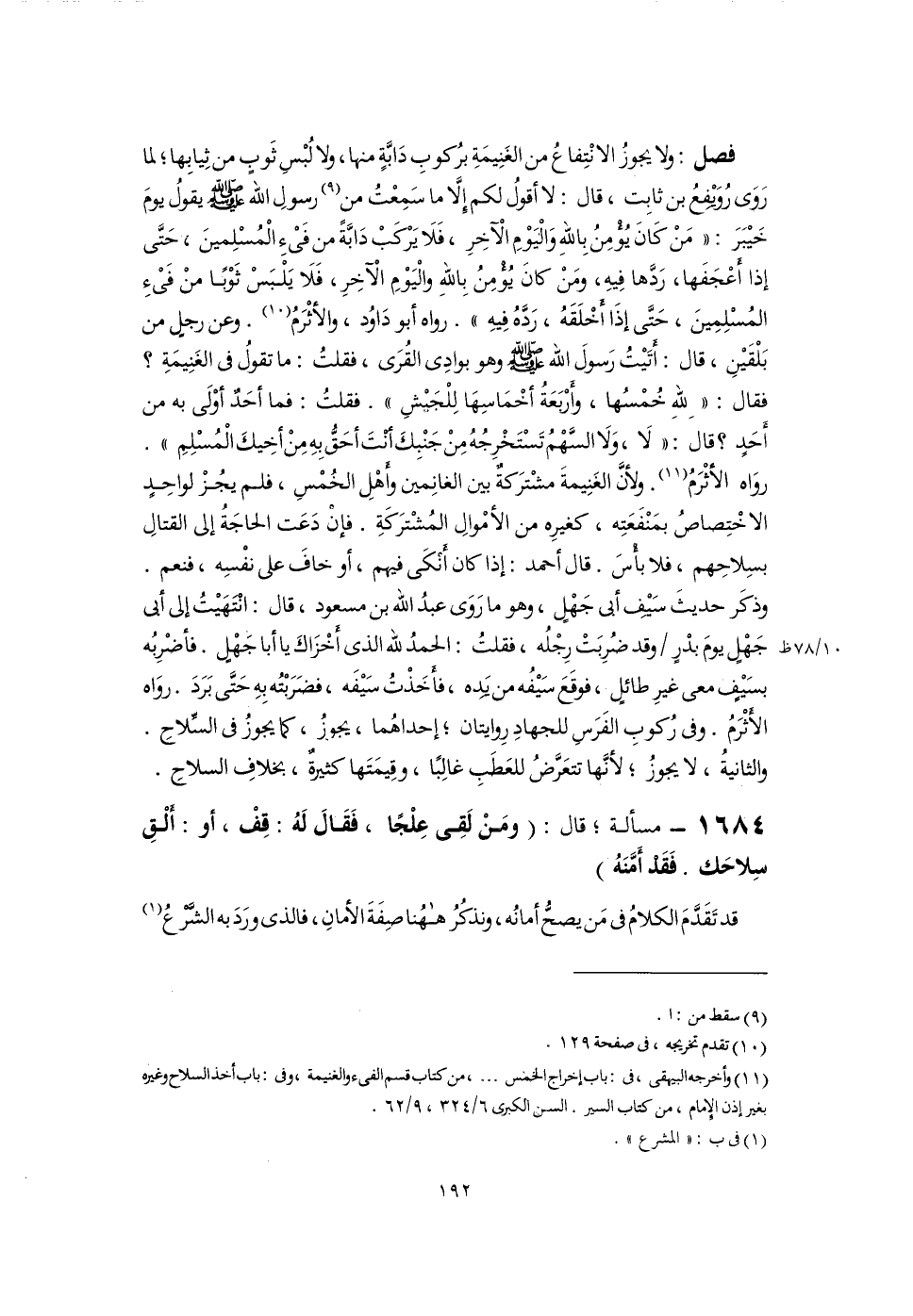 فصل: ولا يجوزُ الانْتِفاعُ من الغَنِيمَةِ برُكوبِ دَابَّةٍ منها، ولا لُبْسِ ثَوبٍ من ثِيابِها؛ لما رَوَى رُوَيْفِعُ بن ثابِت، قال: لا أقولُ لكم إِلَّا ما سَمِعْتُ من (٩) رسولِ اللَّه -صلى اللَّه عليه وسلم- يقولُ يومَ خَيْبَرَ: "مَنْ كَانَ يُؤْمِنُ بِاللَّهِ وَالْيَوْمِ الْآخِرِ، فَلَا يَرْكَبْ دَابَّةً من فَىْءِ الْمُسْلِمينَ، حَتَّى إذا أَعْجَفَها، رَدَّها فِيهِ، ومَنْ كانَ يُؤْمِنُ بِاللَّهِ والْيَوْمِ الآخِرِ، فَلَا يَلْبَسْ ثَوْبًا منْ فَىْءِ المُسْلِمِينَ، حَتَّى إذَا أَخْلَقَهُ، رَدَّهُ فِيهِ". رواه أبو دَاوُد، والأثْرَمُ (١٠). وعن رجلٍ من بَلْقَيْنِ، قال: أَتَيْتُ رَسولَ اللَّه -صلى اللَّه عليه وسلم- وهو بوادِى القُرَى، فقلتُ: ما تقولُ فى الغَنِيمَةِ؟ فقال: "للَّهِ خُمْسُها، وأَرْبَعَةُ أخْمَاسِهَا لِلْجَيْشِ". فقلتُ: فما أحَدٌ أوْلَى به من أَحَدٍ؟ قال: "لَا، وَلَا السَّهْمُ تَسْتَخْرِجُهُ مِنْ جَنْبِكَ أنْتَ أحَقُّ بِهِ مِنْ أخِيكَ الْمُسْلِمِ". روَاه الأَثْرَمُ (١١). ولأنَّ الغَنِيمةَ مشْترَكةٌ بين الغانِمين وأَهْلِ الخُمْسِ، فلم يجُزْ لواحِدٍ الاخْتِصاصُ بمَنْفَعَتِه، كغيرِه من الأمْوالِ المُشْترَكَةِ. فإنْ دَعَت الحاجَةُ إلى القتالِ بسِلاحِهم، فلا بأْسَ. قال أحمد: إذا كان أَنْكَى فيهم، أو خافَ على نفْسِه، فنعم. وذكَر حديثَ سَيْفِ أبى جَهْلٍ، وهو ما رَوَى عبدُ اللَّه بن مسعود، قال: انْتَهَيْتُ إلى أبى جَهْلٍ يومَ بدْرٍ وقد ضُرِبَتْ رِجْلُه، فقلتُ: الحمدُ للَّه الذى أَخْزَاكَ يا أبا جَهْلٍ. فأضْرِبُه بسَيْفٍ معى غيرِ طائلٍ، فوقَعَ سَيْفُه من يَدِه، فأَخَذْتُ سَيْفَه، فضَرَبْتُه بِهِ حَتَّى بَرَدَ. روَاه الأَثْرَمُ. وفى رُكوبِ الفَرَسِ للجهادِ رِوايتان؛ إحداهُما، يجوزُ، كما يجوزُ فى السِّلاحِ. والثانيةُ، لا يجوزُ؛ لأنَّها تتعَرَّضُ للعَطَبِ غالِبًا، وقِيمَتَها كثيرةٌ، بخلافِ السلاحِ.