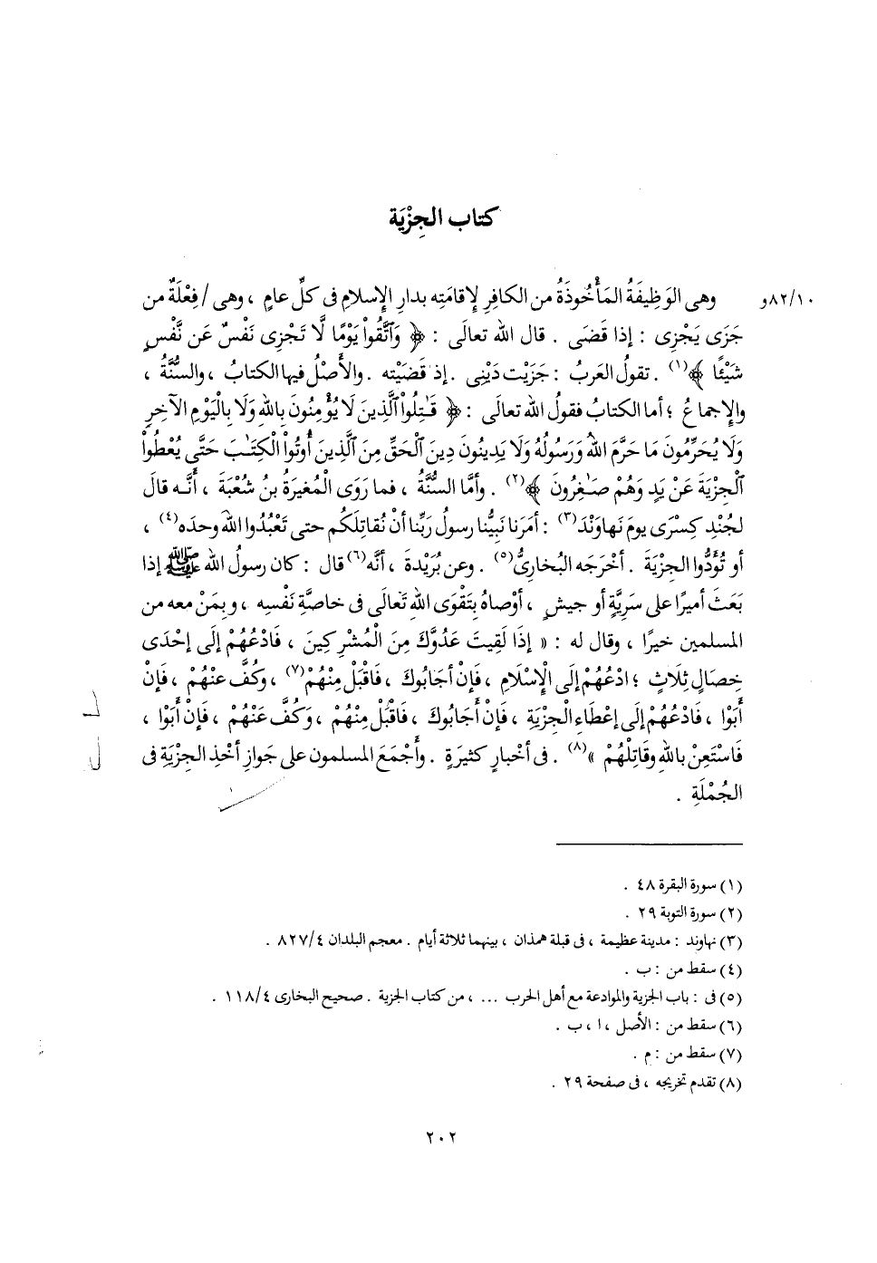 وهى الوَظِيفَةُ المَأْخُوذَةُ من الكافِرِ لإِقامَتِه بدارِ الإِسلامِ فى كلِّ عامٍ، وهى فِعْلَةٌ من جَزَى يَجْزِى: إذا قَضَى. قال اللَّه تعالَى: {وَاتَّقُوا يَوْمًا لَا تَجْزِى نَفْسٌ عَنْ نَفْسٍ شَيْئًا}، (١). تقولُ العَربُ: جَزَيْت دَيْنِى. إذ قَضَيْته. والأَصْلُ فيها الكتابُ، والسُّنَّةُ، والإِجماعُ، أمَّا الكتابُ فقولُ اللَّه تعالَى: {قَاتِلُوا الَّذِينَ لَا يُؤْمِنُونَ بِاللَّهِ وَلَا بِالْيَوْمِ الْآخِرِ وَلَا يُحَرِّمُونَ مَا حَرَّمَ اللَّهُ وَرَسُولُهُ وَلَا يَدِينُونَ دِينَ الْحَقِّ مِنَ الَّذِينَ أُوتُوا الْكِتَابَ حَتَّى يُعْطُوا الْجِزْيَةَ عَنْ يَدٍ وَهُمْ صَاغِرُونَ} (٢). وأمَّا السُّنَّةُ، فما رَوَى الْمُغيرَةُ بنُ شُعْبَةَ، أَنَّه قالَ لجُنْدِ كِسْرَى يومَ نَهاوَنْدَ (٣): أمَرَنا نَبيُّنا رسولُ رَبِّنا أَنْ نُقاتِلَكُم حتَّى تَعْبُدُوا اللَّه وحدَه (٤)، أو تُؤَدُّوا الجِزْيَةَ. أخْرَجَه البُخارِىُّ (٥). وعن بُرَيْدةَ، أنَّه (٦) قال: كان رسولُ اللَّه -صلى اللَّه عليه وسلم- إذا بَعَثَ أميرًا على سَرِيَّةٍ أو جيشٍ، أوْصاهُ بِتَقْوَى اللَّهِ تَعَالَى فى خاصَّةِ نَفْسِه، وبِمَنْ معه من المسلمين خيرًا، وقال له: "إذَا لَقِيتَ عَدُوَّكَ مِنَ الْمُشْرِكِينَ، فَادْعُهُمْ إلَى إحْدَى خِصَالٍ ثِلَاثٍ؛ ادْعُهُمْ إِلَى الإِسْلَامِ، فَإِنْ أَجَابُوكَ، فَاقْبَلْ مِنْهُمْ (٧)، وَكُفَّ عنْهُمْ، فَإِنْ أَبَوْا، فَادْعُهُمْ إلَى إعْطَاءِ الْجزْيَةِ، فَإِنْ أَجَابُوكَ، فَاقبَلْ مِنْهُمْ، وَكُفَّ عَنْهُمْ، فَإِنْ أَبَوْا، فَاسْتَعِنْ باللَّهِ وقَاتِلْهُمْ" (٨). فى أخْبارٍ كثيرَةٍ. وأَجْمَعَ المسلمون على جَوازِ أخْذِ الجِزْيَةِ فى الجُمْلَةِ.