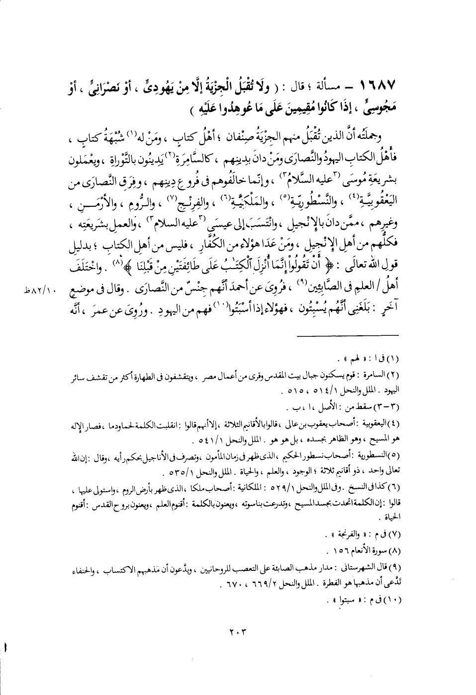 وجملَتُه أَنَّ الذين تُقْبَلُ منهم الجِزْيَةُ صِنْفان؛ أهْلُ كتابٍ، ومَنْ له (١) شُبْهَةُ كتابٍ، فأَهْلُ الكتابِ اليهودُ والنَّصارَى ومَنْ دانَ بدِينِهم، كالسَّامِرَةِ (٢) يَدينُون بالتَّوْراةِ، ويعْمَلون بشريعَةِ مُوسَى [عليه السَّلامُ] (٣)، وإنّما خالَفُوهم فى فُروعِ دِينِهم، وفِرَقِ النَّصارَى من اليَعْقُوبِيَّةِ (٤)، والنَّسْطورِيّةِ (٥)، والمَلْكِيَّةِ (٦)، والفِرِنْجِ (٧)، والرُّومِ، والأرْمَنِ، وغيرِهم، ممَّن دانَ بالإِنْجيلِ، وانْتَسَبَ إلى عيسَى [عليه السلام] (٣)، والعملِ بشَريعَتِه، فكلُّهم من أهلِ الإِنْجِيلِ، ومَنْ عَدَا هؤلاء من الكُفَّارِ، فليس من أهلِ الكِتَابِ؛ بدليلِ قولِ اللَّه تعالَى: {أَنْ تَقُولُوا إِنَّمَا أُنْزِلَ الْكِتَابُ عَلَى طَائِفَتَيْنِ مِنْ قَبْلِنَا} (٨). واخْتَلَفَ أهلُ العلمِ فى الصَّابِئِين (٩)، فرُوِىَ عن أحمدَ أَنَّهم جِنْسٌ من النَّصارَى. وقال فى موضعٍ آخَرٍ: بَلَغَنِى أنَّهُم يُسْبِتُون، فهؤلاءإذا أسْبَتُوا (١٠) فهم من اليهودِ. ورُوِىَ عن عمرَ، أنَّه