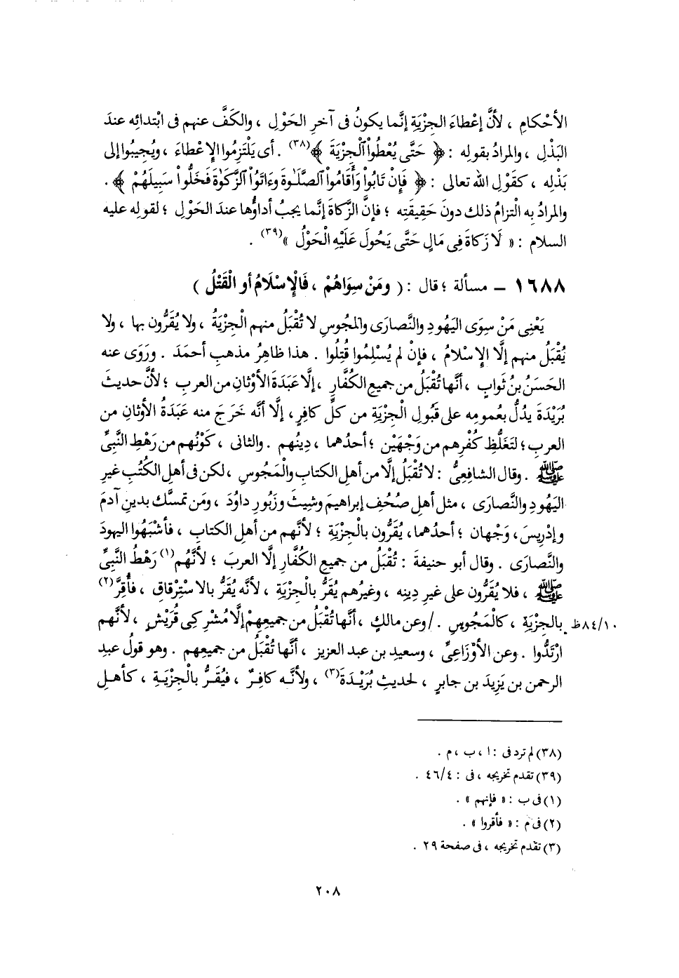 يَعْنِى مَنْ سِوَى اليَهُودِ والنَّصارَى والمجُوسِ لا تُقْبَلُ منهم الْجِزْيَةُ، ولا يُقَرُّون بها، ولا يقْبَلُ منهم إِلَّا الْإِسْلَامُ، فإنْ لم يُسْلِمُوا قُتِلُوا. هذا ظاهِرُ مذهبِ أحمَدَ. ورَوَى عنه الحَسَنُ بنُ ثَوابٍ، أنَّها تُقْبَلُ من جميعِ الكُفَّارِ، إلَّا عَبَدَةَ الأوْثانِ من العربِ؛ لأنَّ حديثَ بُرَيْدَةَ يدُلُّ بعُمومِه على قبولِ الْجِزْيَةِ من كلِّ كافِرٍ، إلَّا أَنَّه خَرَجَ منه عَبَدَةُ الأوثانِ من العربِ؛ لتَغَلُّظِ كُفْرِهم من وَجْهَيْن، أحدُهما، دِينُهم. والثانى، كَوْنُهم من رَهْطِ النَّبِىِّ -صلى اللَّه عليه وسلم-. وقال الشافِعِىُّ: لا تُقْبَلُ إلَّا من أهلِ الكتابِ والْمَجُوسِ، لكن فى أهلِ الكُتُبِ غيرِ اليَهُودِ والنَّصارَى، مثل أهلِ صُحُفِ إبراهيمَ وشِيثَ وزَبُورِ داوُدَ، ومَن تمسَّك بدينِ آدمَ وإدْرِيسَ، وَجْهان؛ أحدُهما، يُقَرُّون بالْجِزْيَةِ؛ لأنَّهم من أهلِ الكتاب، فأشْبَهُوا اليهودَ والنَّصارَى. وقال أبو حنيفةَ: تُقْبَلُ من جميعِ الكُفَّارِ إلَّا العربَ، لأَنَّهُم (١) رَهْطُ النَّبِىِّ -صلى اللَّه عليه وسلم-، فلا يُقَرُّون على غيرِ دِينِه، وغيرُهم يُقَرُّ بالْجِزْيَةِ؛ لأنَّه يُقَرُّ بالاسْتِرْقاقِ، فأُقِرَّ (٢) بالْجِزْيَةِ، كالْمَجُوسِ. وعن مالِك، أنَّها تُقْبَلُ من جميعِهِمْ إلَّا مُشْرِكِى قرَيْشٍ؛ لأنَّهم ارْتَدُّوا. وعن الأَوْزَاعِىِّ، وسعيدِ بن عبد العزيز، أنَّها تُقْبَلُ من جميعِهم. وهو قولُ عبدِ الرحمن بن يَزِيدَ بن جابرٍ، لحديثِ بُرَيْدَةَ (٣)، ولأنَّه كافِرٌ، فيُقَرُّ بالْجِزْيَةِ، كأهلِ