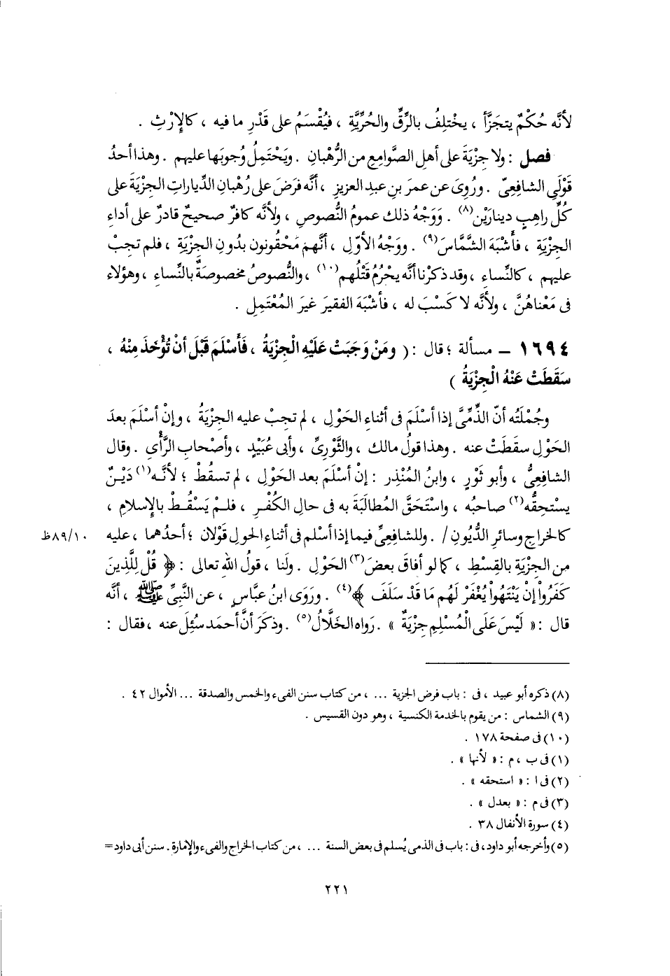 وجُمْلَتُه أن الذِّمِّىَّ إذا أسْلَمَ فى أثناءِ الحَوْلِ، لم تجِبْ عليه الجِزْيَةُ، وإِنْ أسْلَمَ بعدَ الحَوْلِ سقَطَتْ عنه. وهذا قولُ مالك، والثَّوْرِىِّ، وأبى عُبَيْدٍ، وأصْحابِ الرَّأْىِ. وقال الشافِعِىُّ، وأبو ثَوْرٍ، وابنُ المُنْذِر: إنْ أسْلَمَ بعد الحَوْلِ، لم تسقُطْ؛ لأنَّه (١) دَيْنٌ يسْتحِقُّه (٢) صاحبُه، واسْتَحَقَّ المُطالَبَةَ به فى حالِ الكُفْرِ، فلمْ يَسْقُطْ بالإِسلامِ، كالخراجِ وسائرِ الدُّيُونِ. وللشافِعِىِّ فيما إذا أسْلم فى أثناءِ الحولِ قَوْلان؛ أحدُهما، عليه من الجِزْيَةِ بالقِسْطِ، كما لو أفاقَ بعضَ (٣) الحَوْلِ. ولَنا، قولُ اللَّهِ تعالى: {قُلْ لِلَّذِينَ كَفَرُوا إِنْ يَنْتَهُوا يُغْفَرْ لَهُمْ مَا قَدْ سَلَفَ} (٤). ورَوَى ابنُ عباسٍ، عن النَّبِىِّ -صلى اللَّه عليه وسلم-، أنَّه قال: "لَيْسَ عَلَى الْمُسْلِمِ جِزْيَةٌ". رَواه الخَلَّالُ (٥). وذكَرَ أَنَّ أحمَد سُئِلَ عنه، فقال: