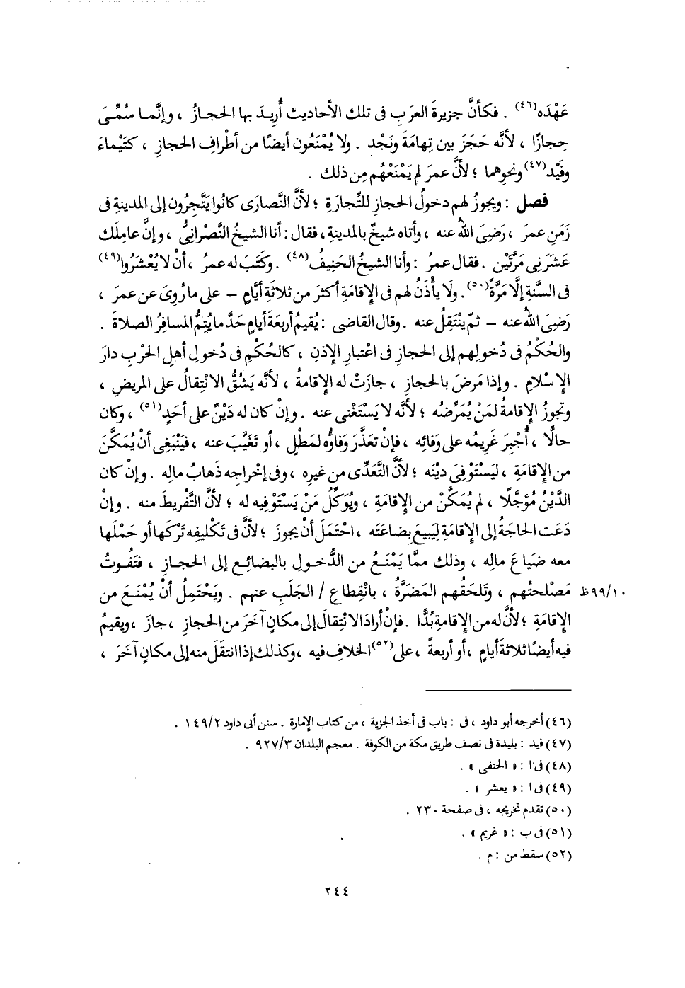 عَهْدَه (٤٦). فكأنَّ جزيرةَ العرَبِ فى تلك الأحاديث أُريِدَ بها الحجازُ، وإنَّما سُمِّىَ حِجازًا؛ لأنَّه حَجَزَ بين تِهامَةَ ونَجْد. ولا يُمْنَعُون أيضًا من أطْرافِ الحجازِ، كتَيْماءَ وفَيْد (٤٧) ونحوِهما؛ لأنَّ عمرَ لم يَمْنَعْهُم مِن ذلك.